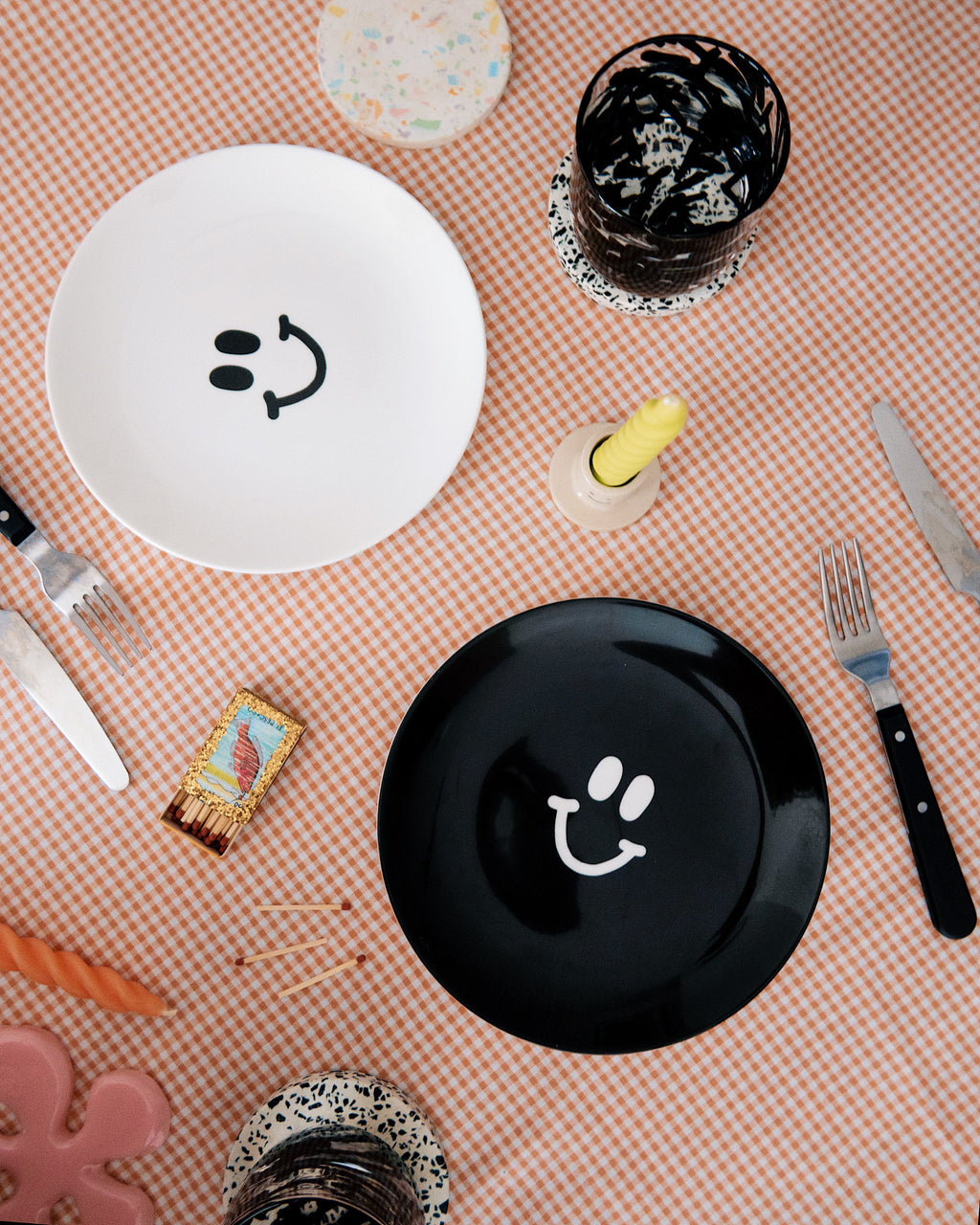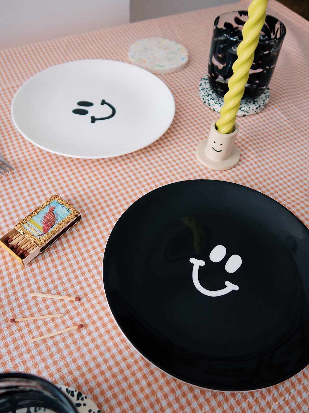 - White plate with happy face print in black