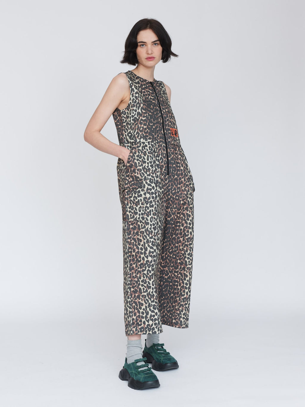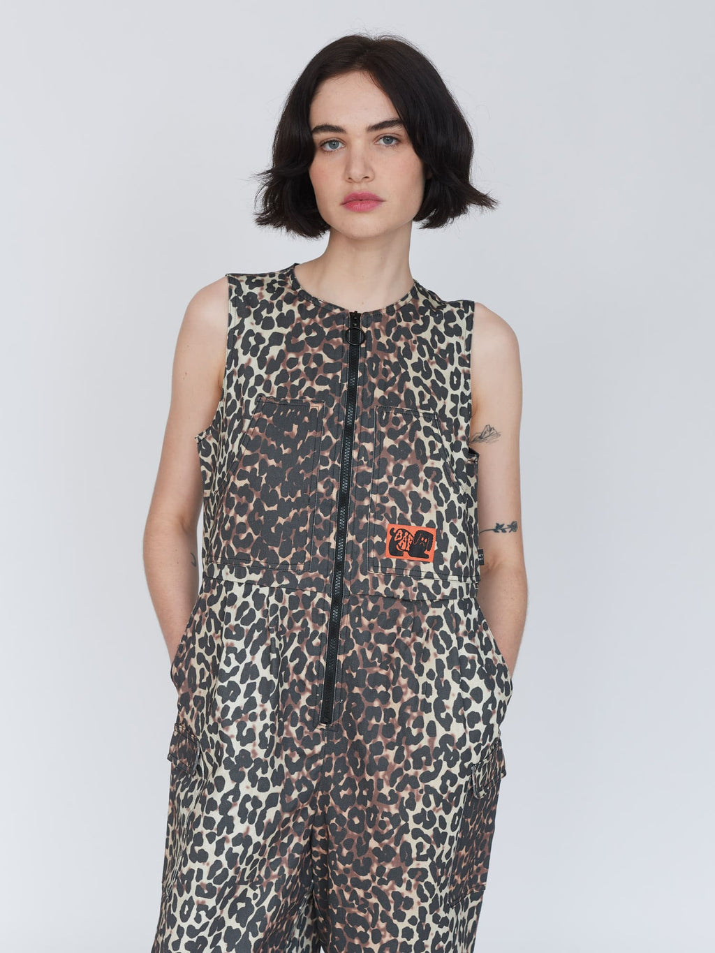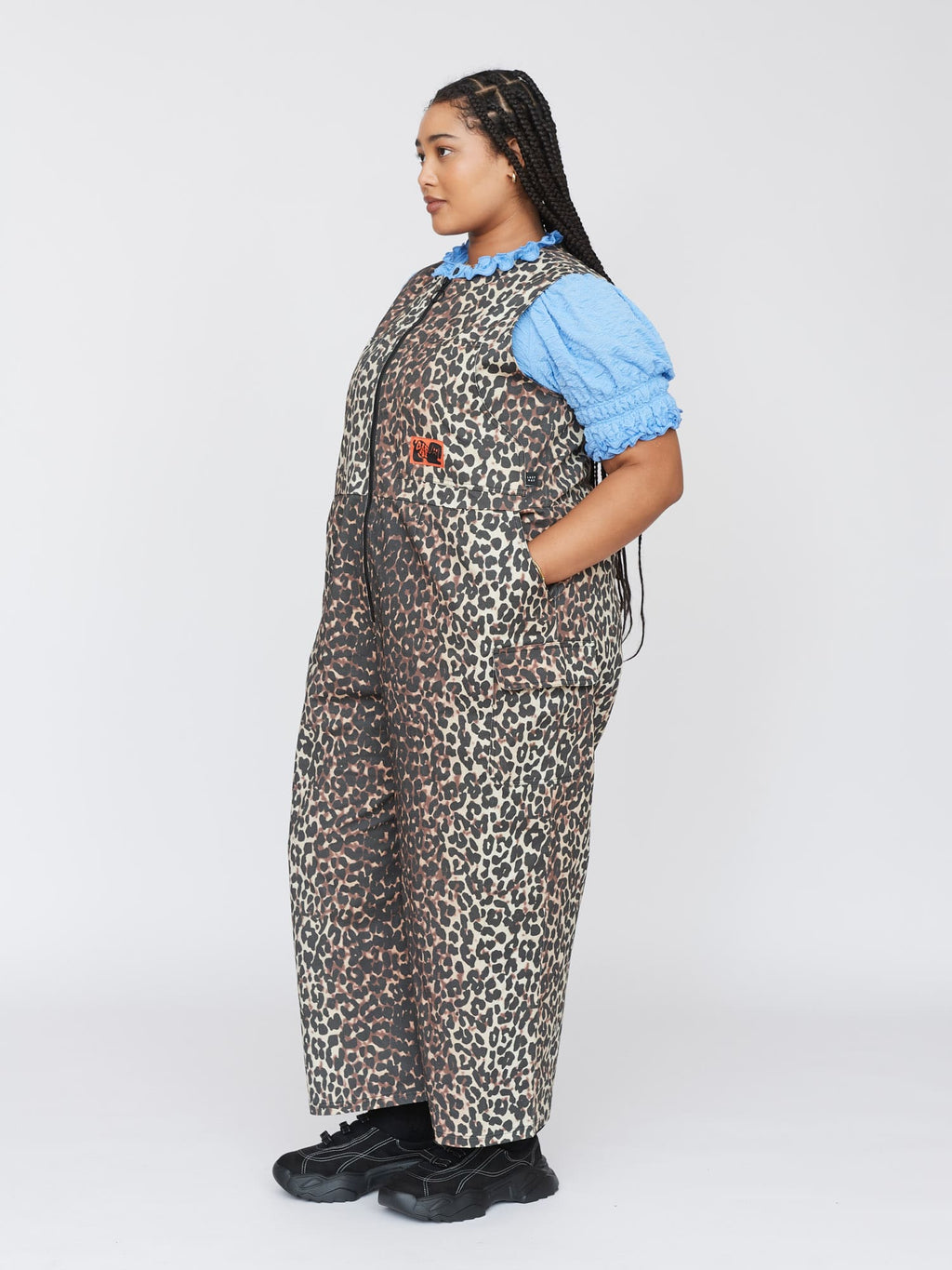 Our best-selling gilet jumpsuit style is sleeveless with a gathered waist, to give an easy fit, and has a cropped wide leg. Down the centre is a front zip closure with a ring zip puller, and it has chest, hip, and leg pockets. Made from a heavyweight 100% cotton twill material, it features an all over leopard print design along with a Oaf woven patch on the chest pocket. Take a walk on the wild side and pair it with our Leopard Frill Tote Bag.