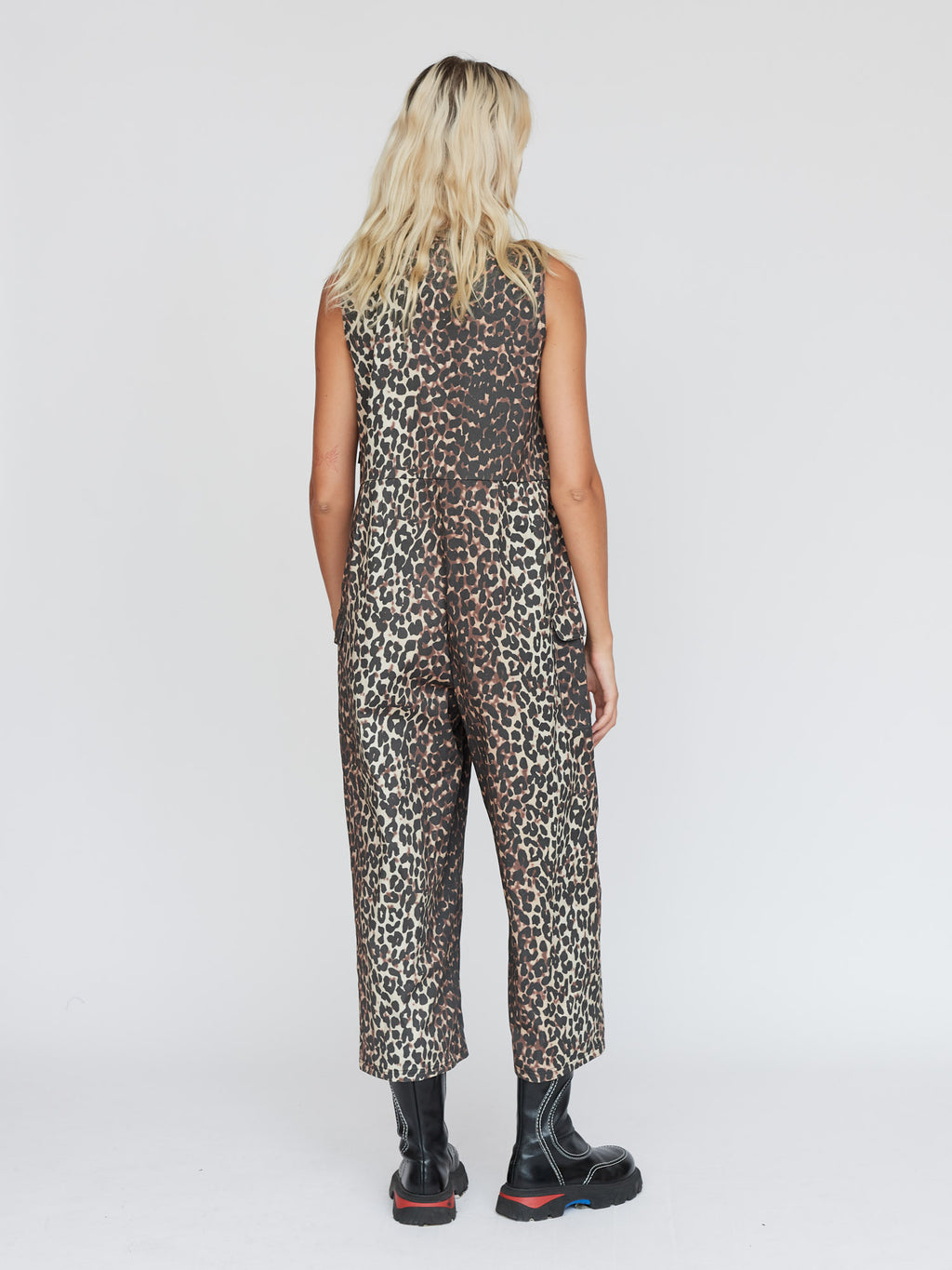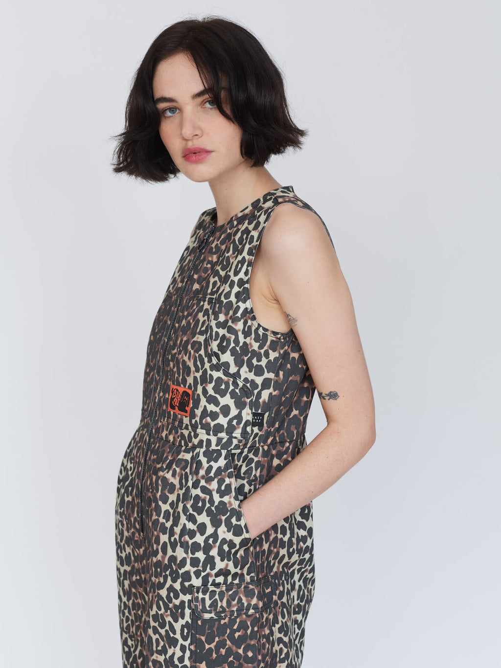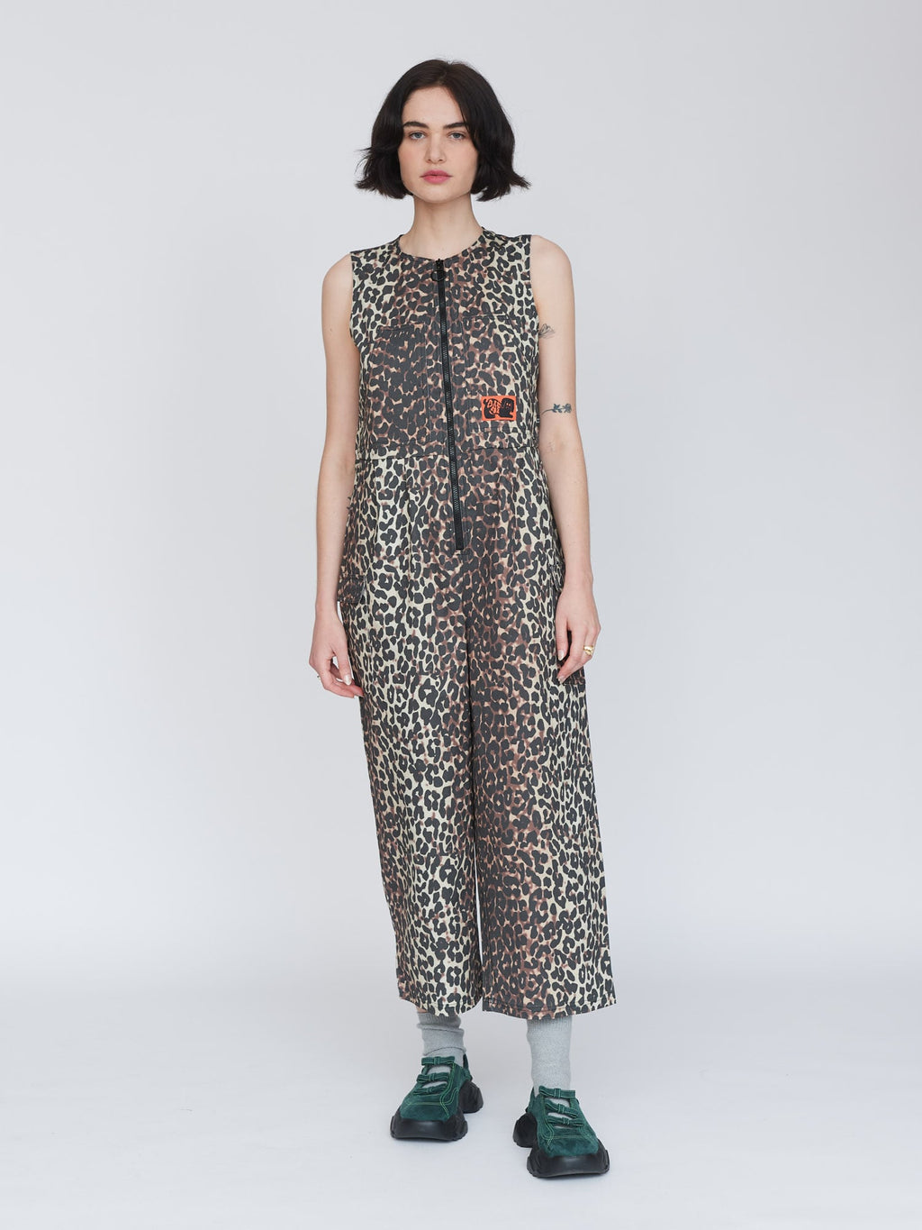 Our best-selling gilet jumpsuit style is sleeveless with a gathered waist, to give an easy fit, and has a cropped wide leg. Down the centre is a front zip closure with a ring zip puller, and it has chest, hip, and leg pockets. Made from a heavyweight 100% cotton twill material, it features an all over leopard print design along with a Oaf woven patch on the chest pocket. Take a walk on the wild side and pair it with our Leopard Frill Tote Bag.