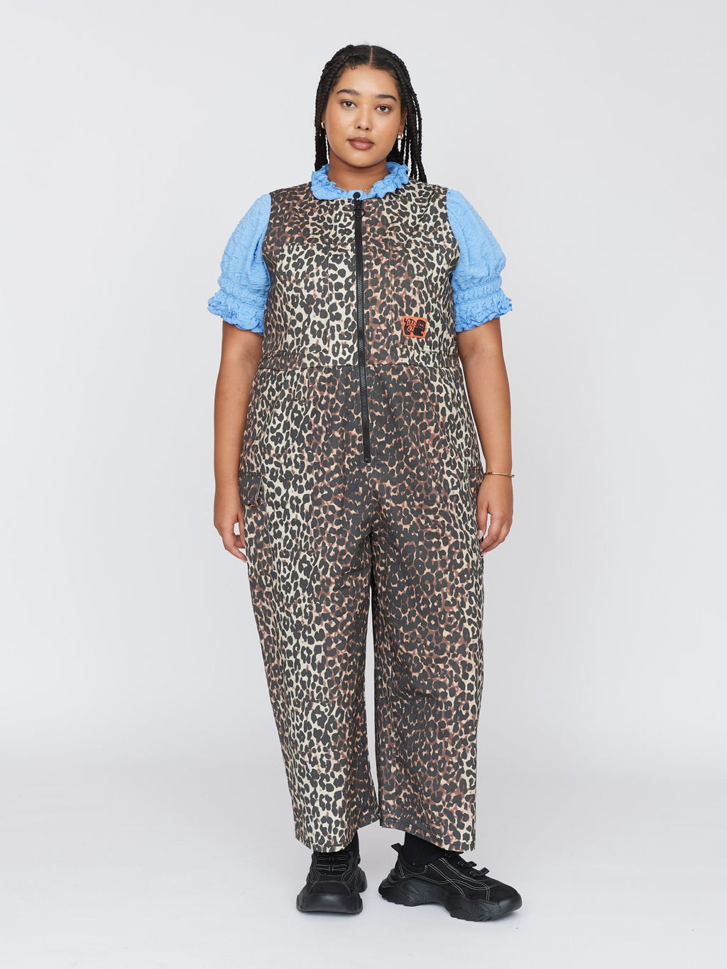 Our best-selling gilet jumpsuit style is sleeveless with a gathered waist, to give an easy fit, and has a cropped wide leg. Down the centre is a front zip closure with a ring zip puller, and it has chest, hip, and leg pockets. Made from a heavyweight 100% cotton twill material, it features an all over leopard print design along with a Oaf woven patch on the chest pocket. Take a walk on the wild side and pair it with our Leopard Frill Tote Bag.Need help with your order? CONTACT US