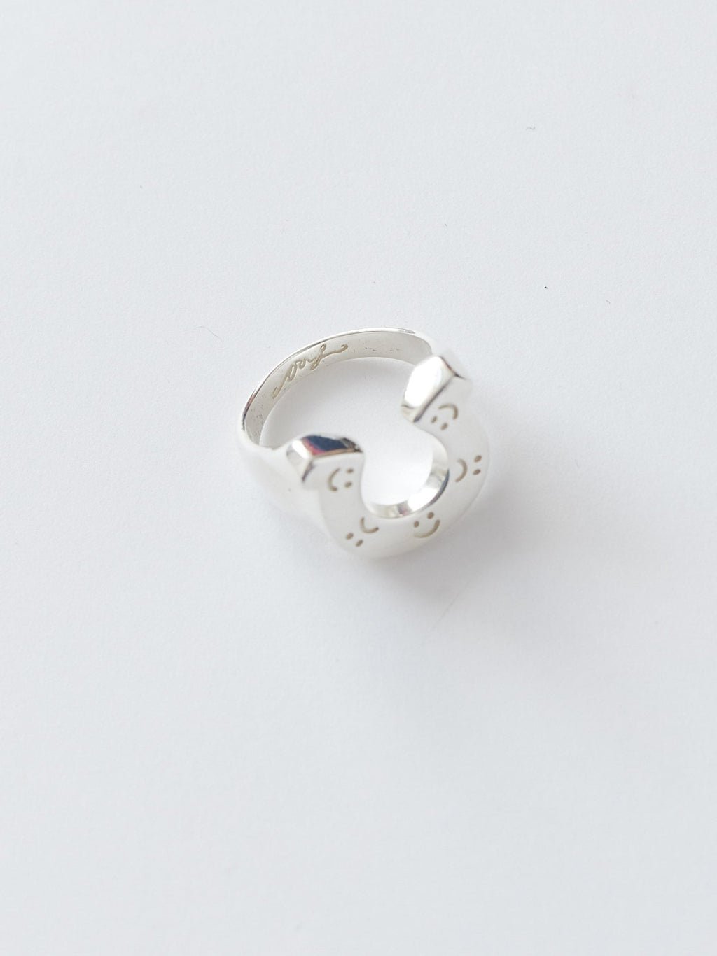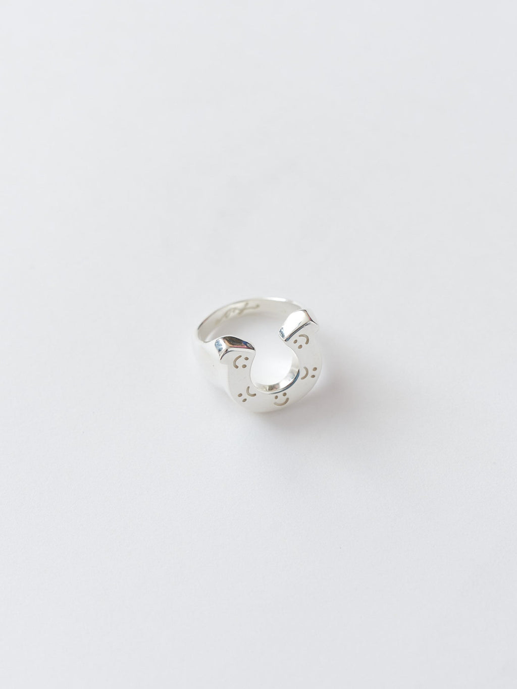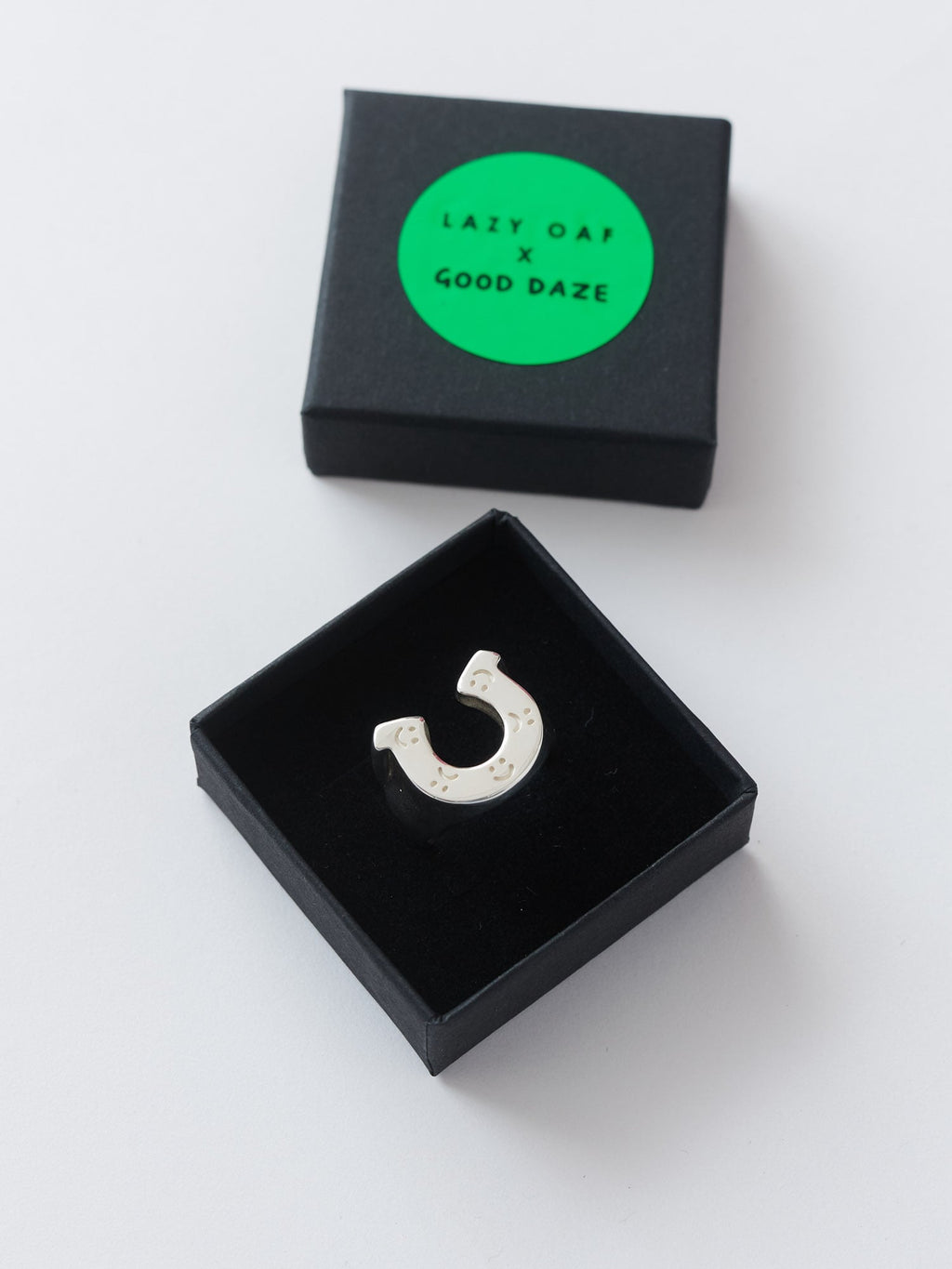 This horseshoe shaped ring is part of our collaboration with independent jewellery brand Good Daze. Stocked in Sterling Silver and 18k Gold Vermeil, it features our signature Happy Sad graphic engraved onto the horseshoe, as well as ‘Oaf’ engraved on the inside.