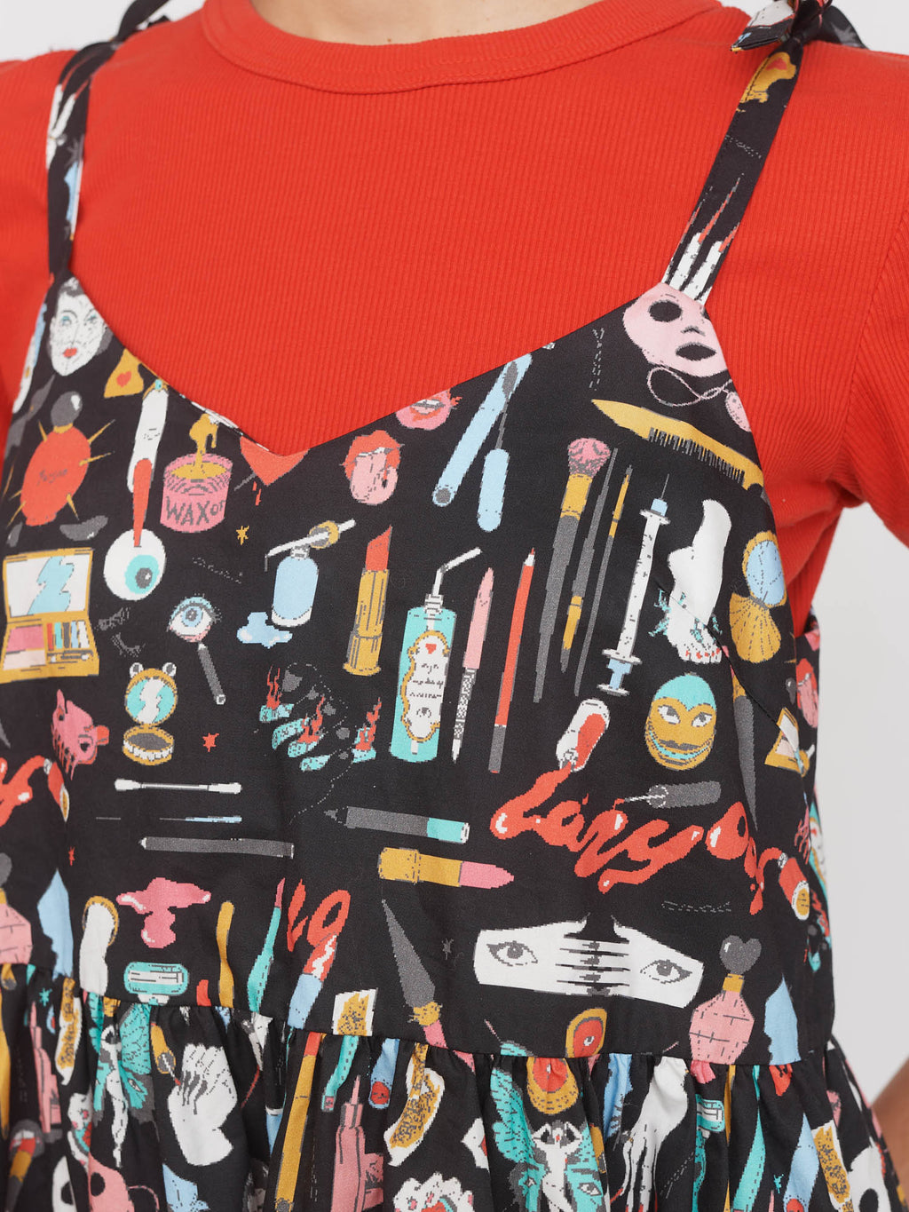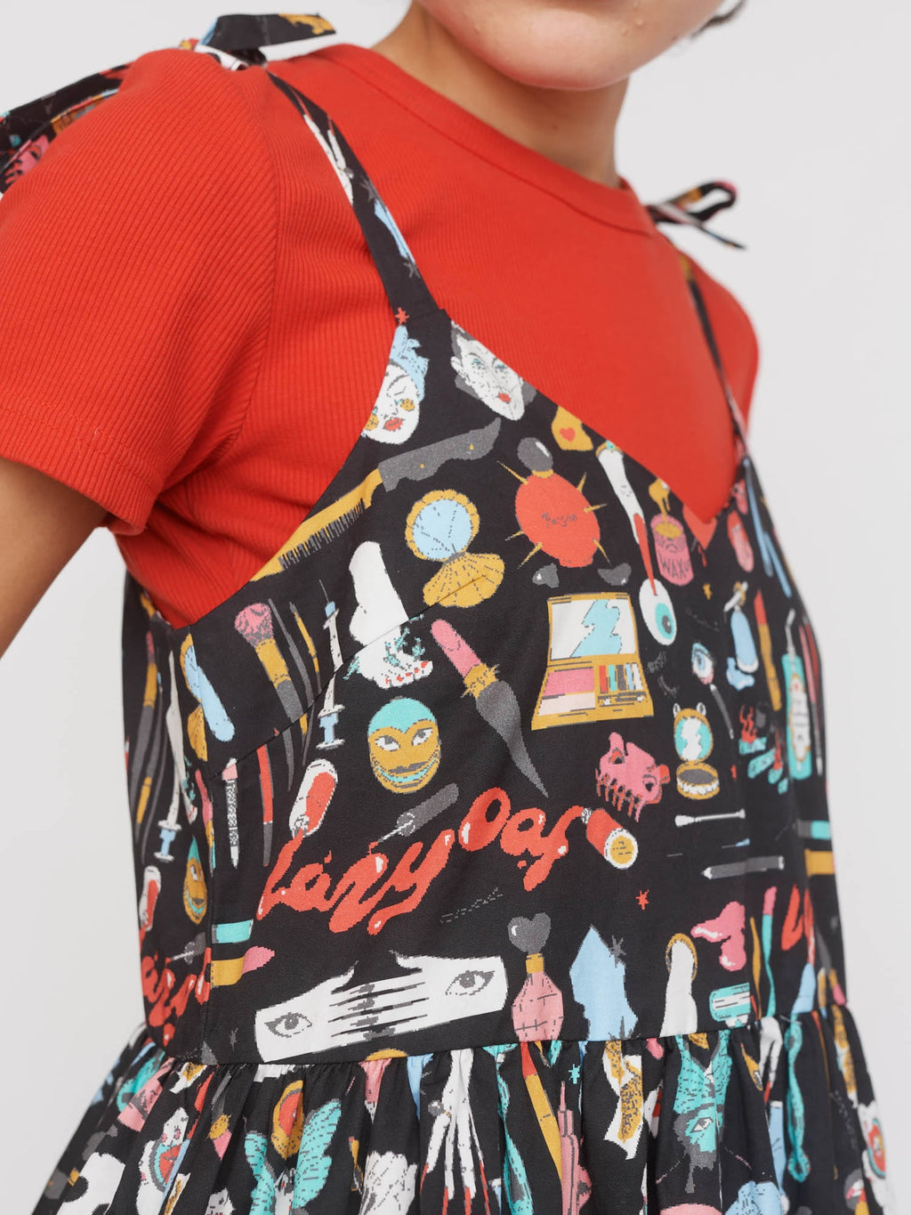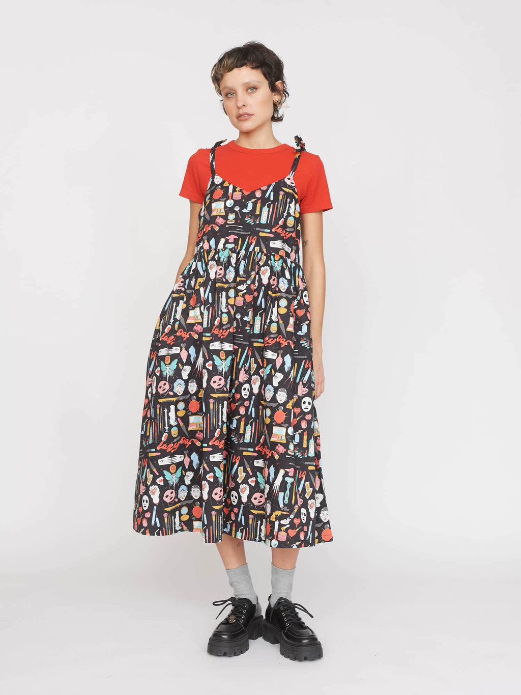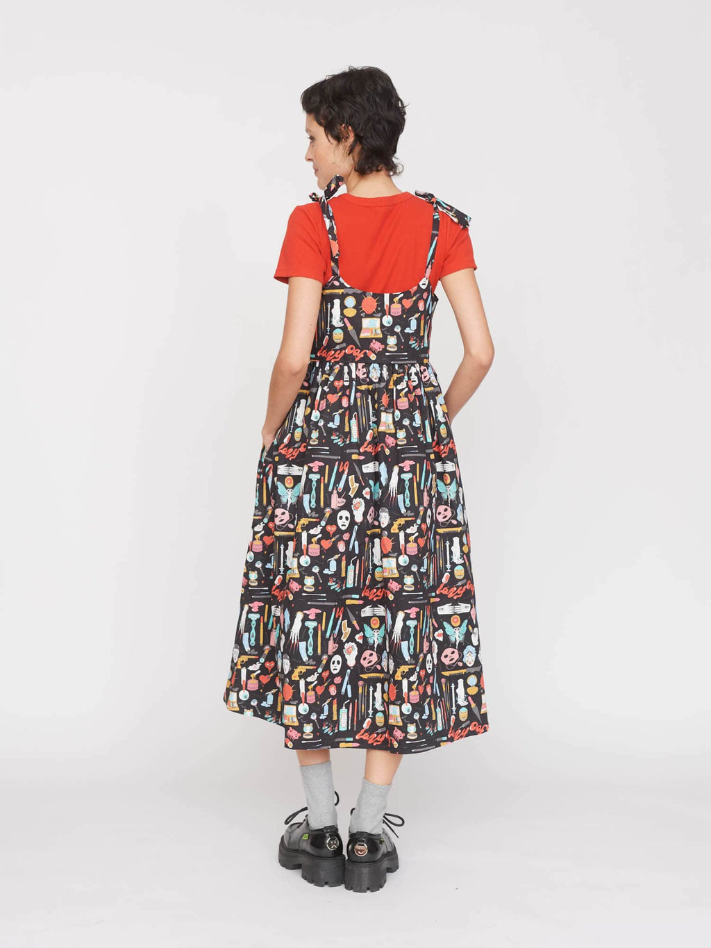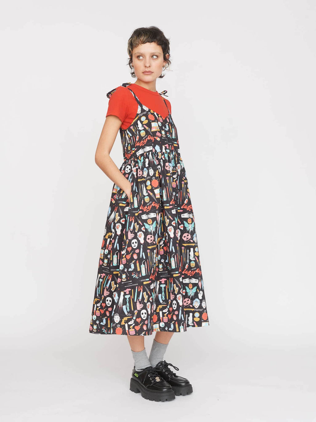 Black Eyed Peas The Beginning album art meets Laura Callaghan.  In an all over print designed by Irish artist Laura Callaghan, this midi dress has fully adjustable tie shoulders and a fitted bodice with a full skirt. There are side seam pockets and it’s fastenable by a concealed side seam zip. Made from 100% cotton, this dress will be perfect for layering or wearing alone making it a perfect all rounder for your wardrobe