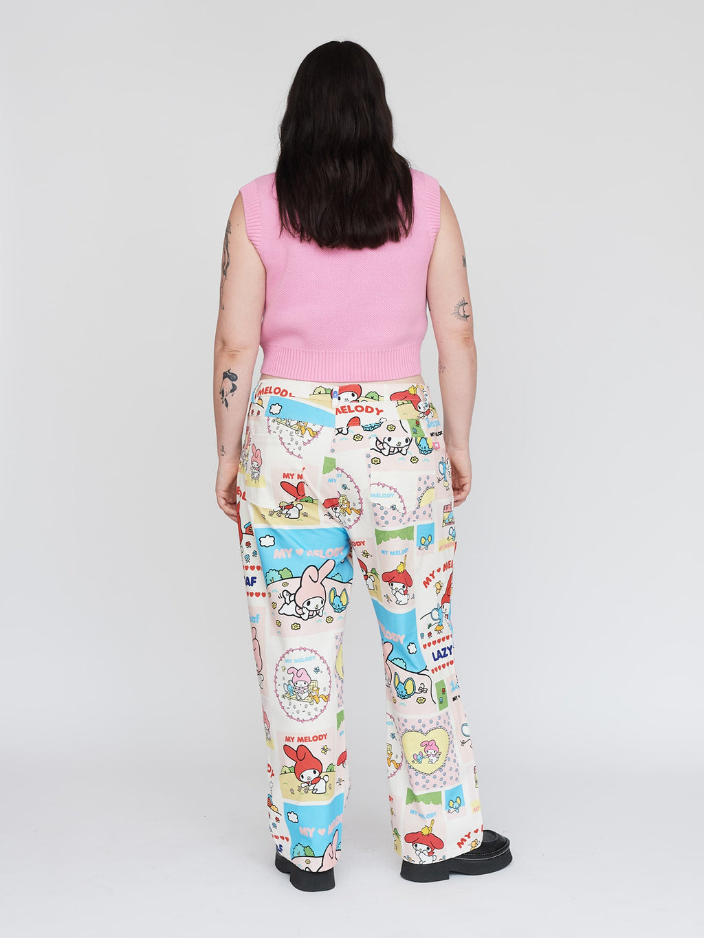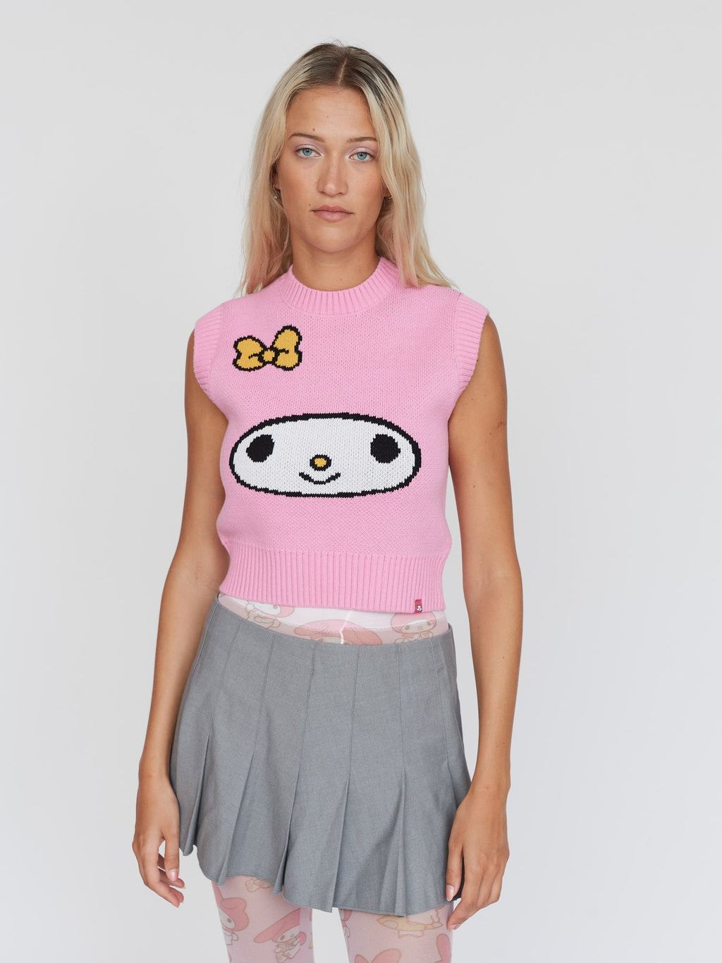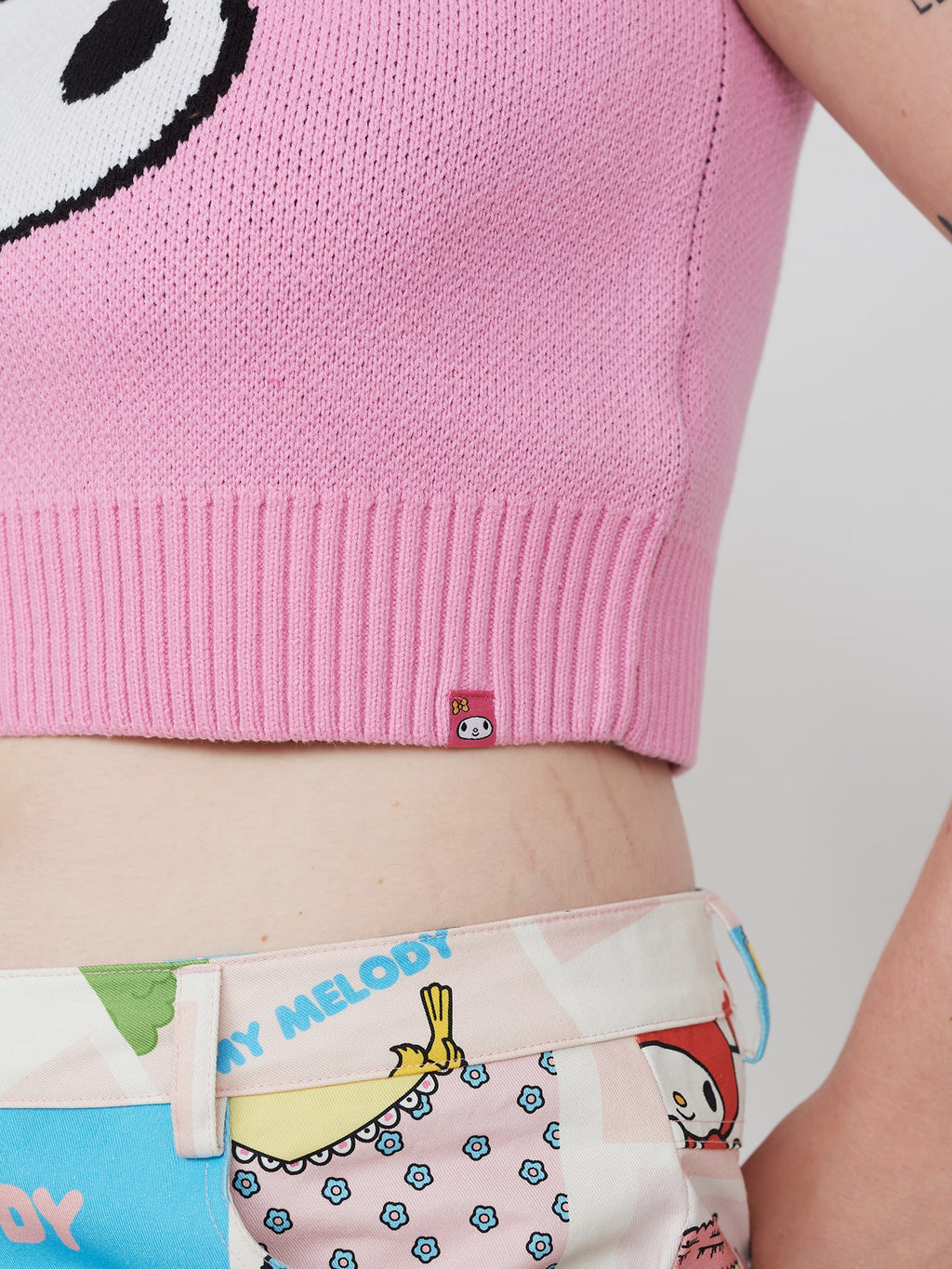 In a cropped length, this knitted vest has a placement intarsia My Melody design for our Lazy Oaf - My Melody collection. In pink, it has ribbed armholes, neck and hem and has bespoke labelling as well as swing tag for the collection.