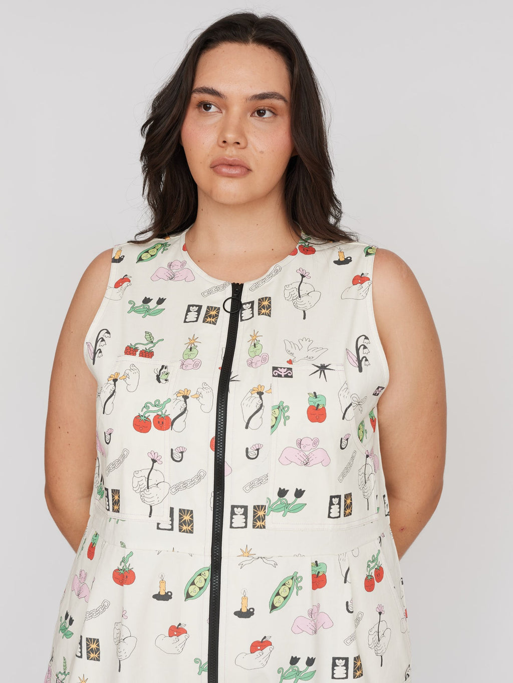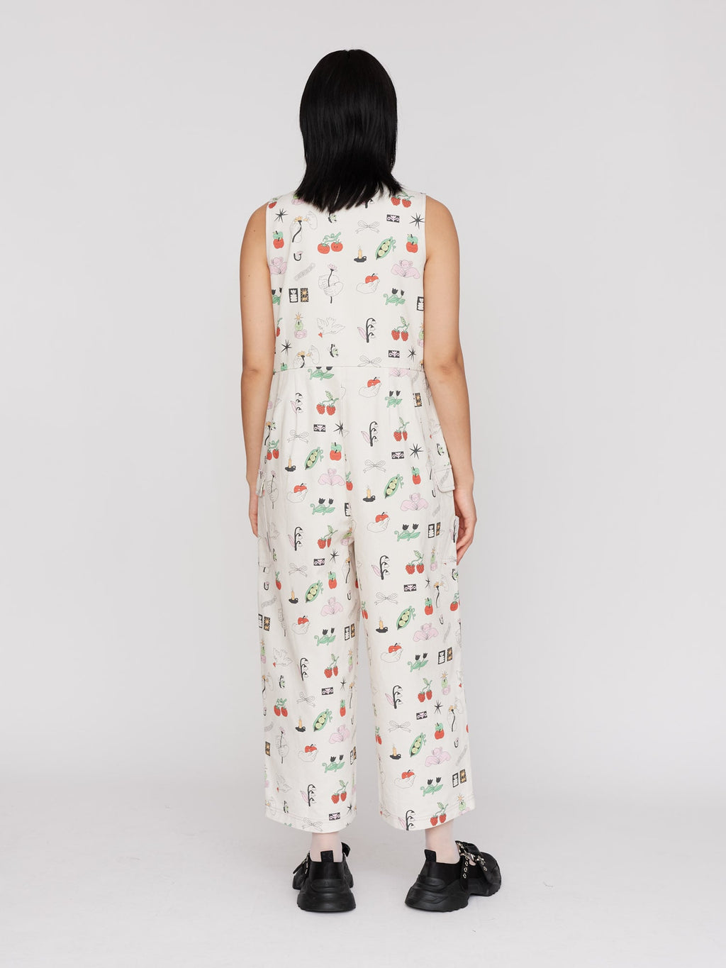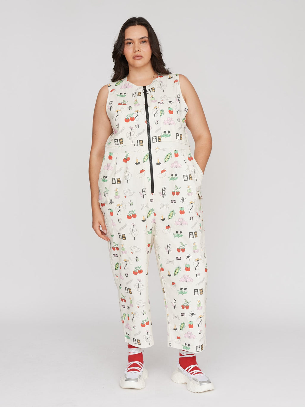 Made from 100% cotton, this sleeveless gilet style jumpsuit has a front zip closure with a ring zip puller. With a relaxed fit and gathered waist into a cropped wide leg, this jumpsuit is the perfect everyday piece, this does tend to fit oversized, so for a more fitted look size down. The ease of wear doesn’t stop there, as this jumpsuit has chest, hip and leg pockets so there’s somewhere for everything you need. Across this off white jumpsuit are prints by British artist Poppy Crew as part of our Lazy Oaf Introduces collection. Wear alone or why not layer with your favourite white tee underneath it?