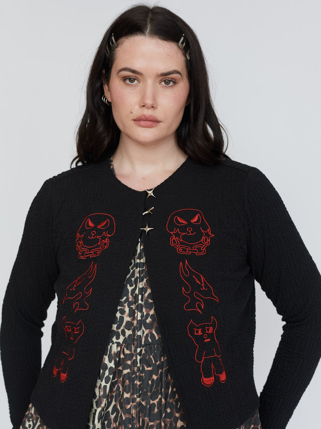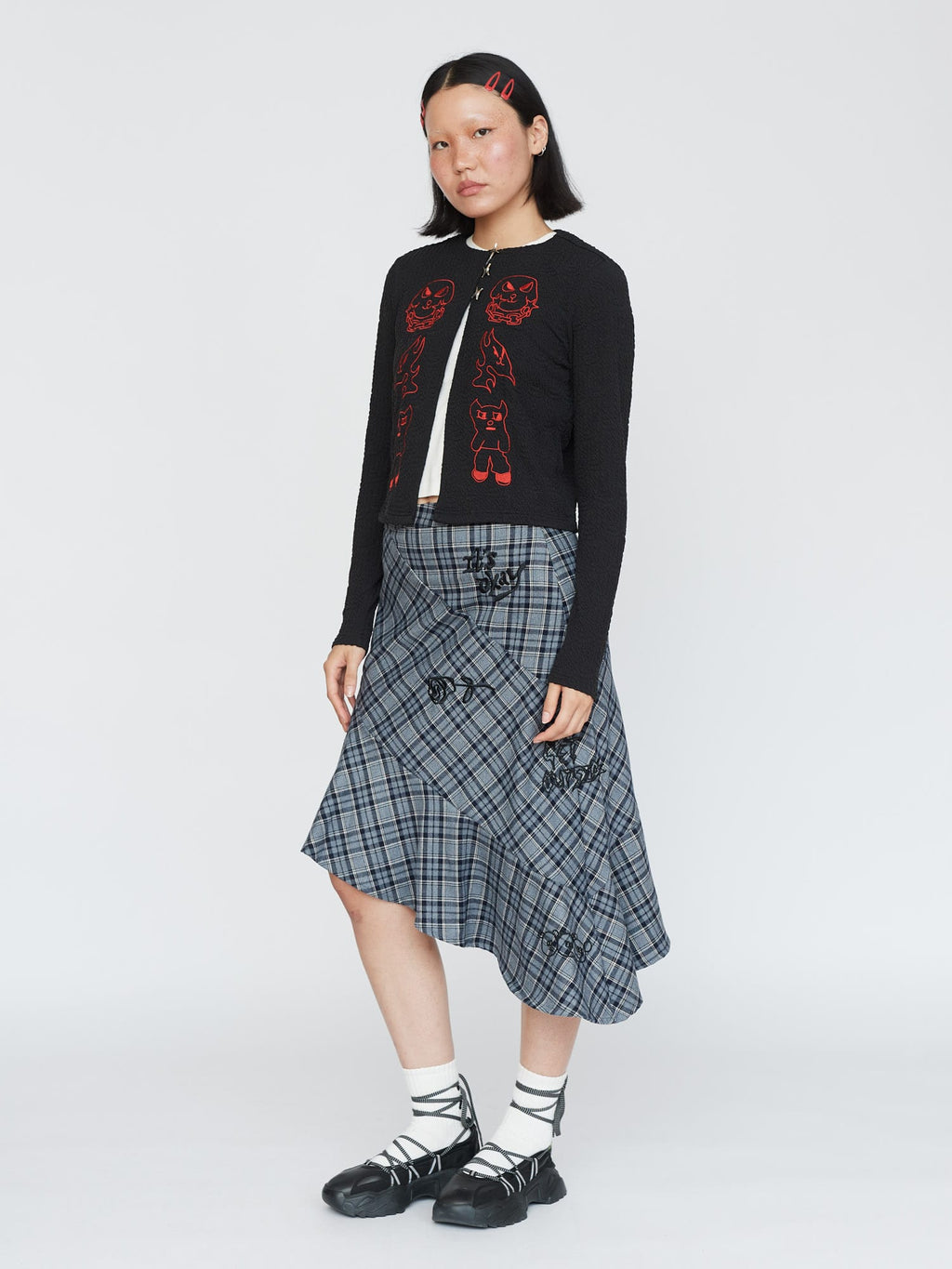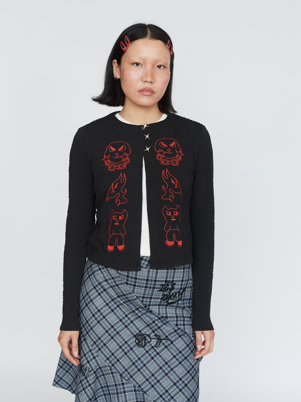 This textured fabric cardigan is a new for us, in a slightly cropped length, it has three star shaped buttons at the top. On the front in a contrasting red are embroidered designs by artist Visaya Hoffie (@vissyhoffie). Layer over a white tee and pair it with our Doodles Skirt for the perfect autumnal look.