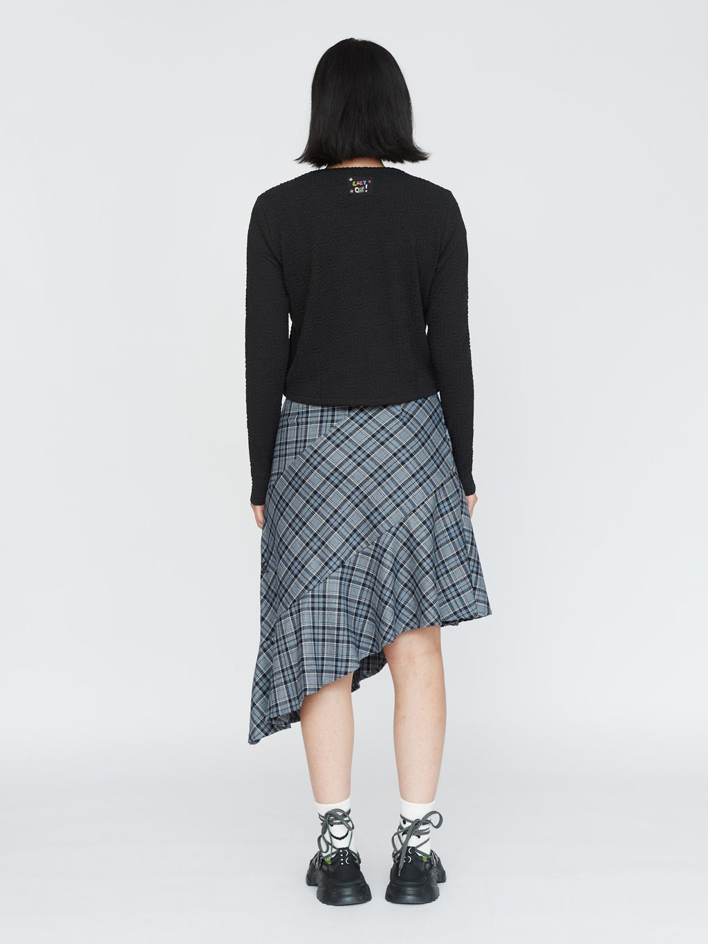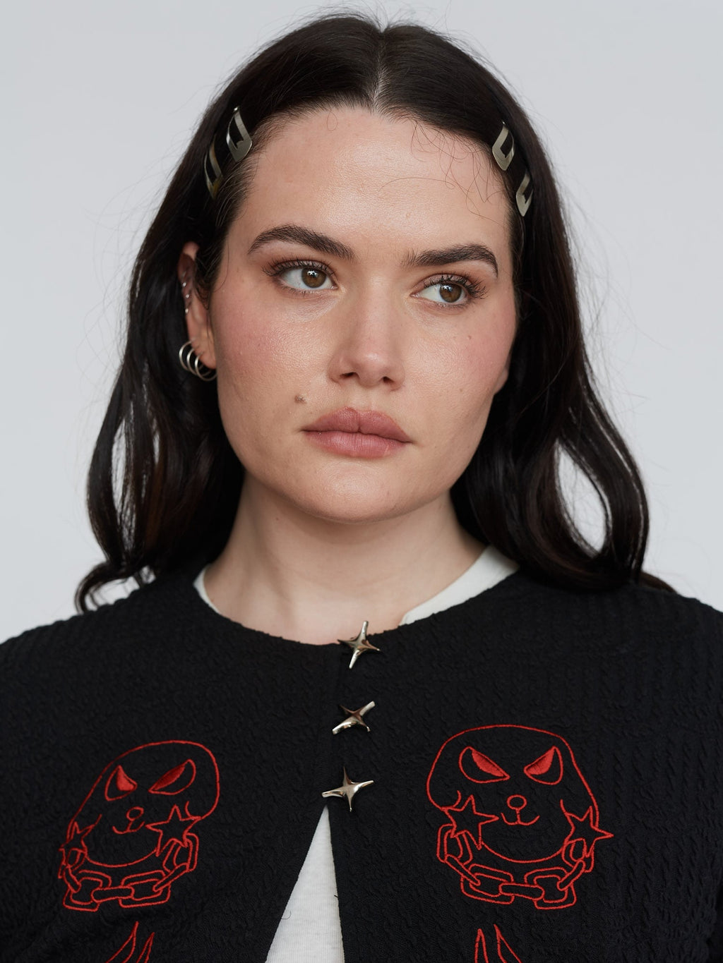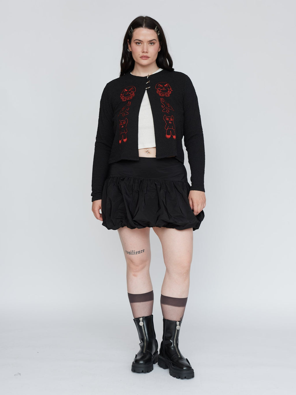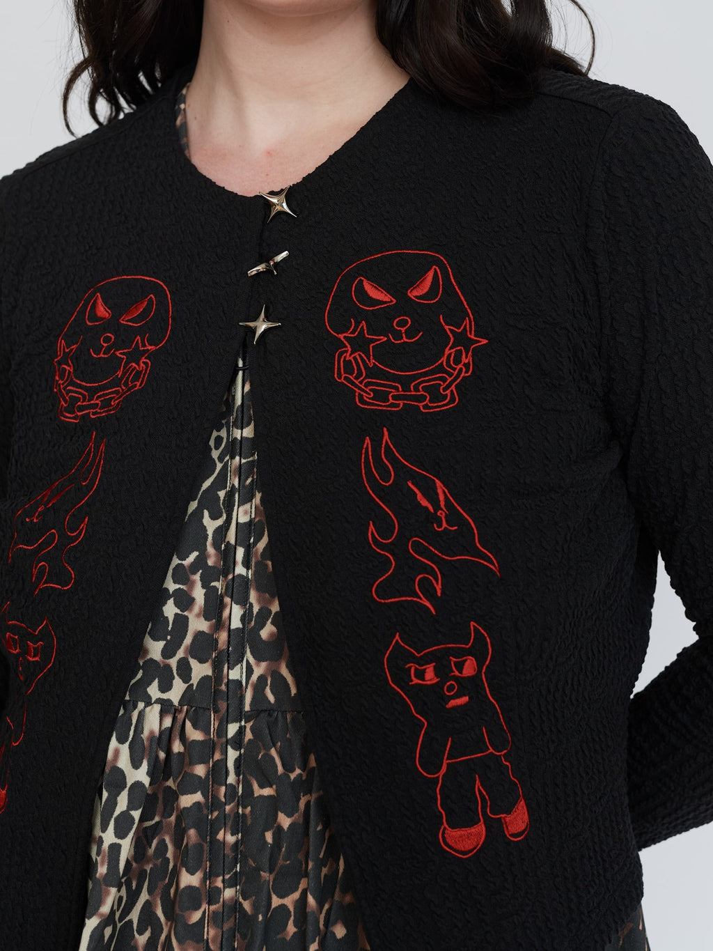 This textured fabric cardigan is a new for us, in a slightly cropped length, it has three star shaped buttons at the top. On the front in a contrasting red are embroidered designs by artist Visaya Hoffie (@vissyhoffie). Layer over a white tee and pair it with our Doodles Skirt for the perfect autumnal look.