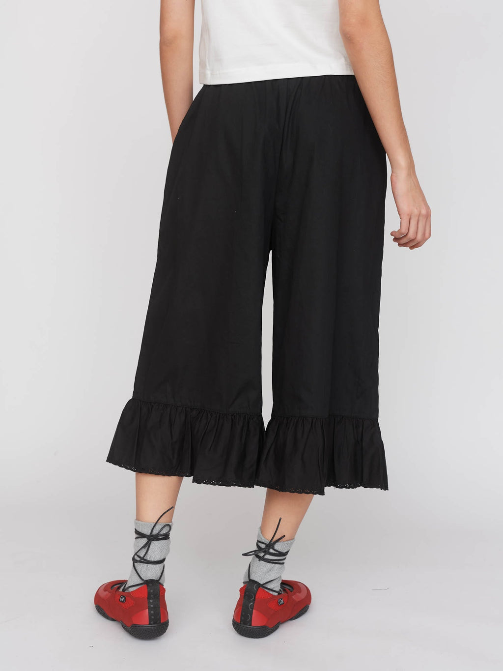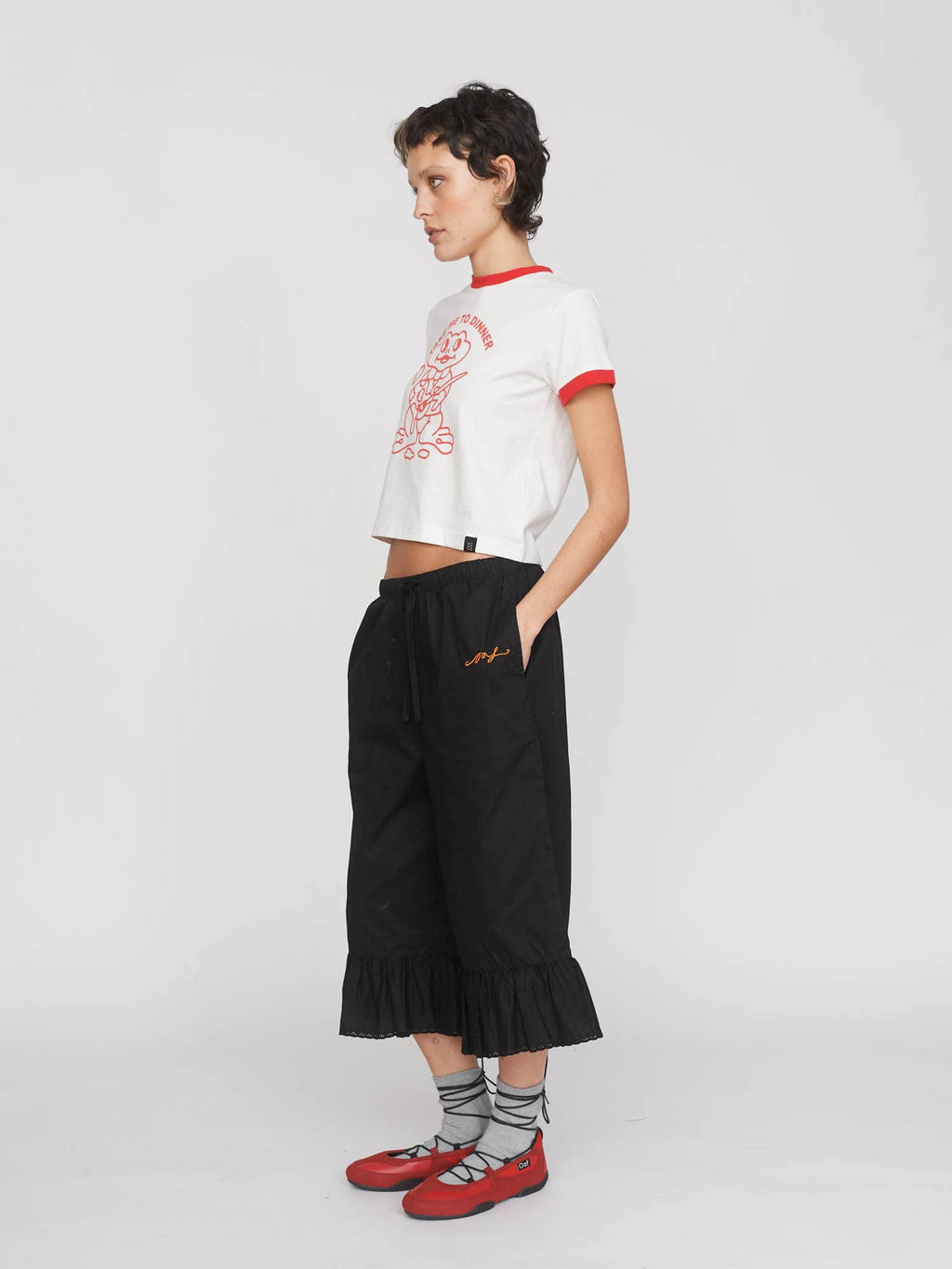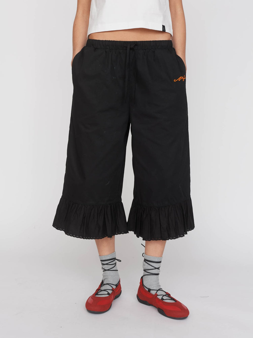 These wide leg culotte trousers have an elasticated drawcord waistband with an embroidered ruffle hem detail. In black, they have side seam pockets and feature an orange Oaf embroidered on the left side. Wear alone, or for the colder months, layer your favourite block coloured tights underneath.