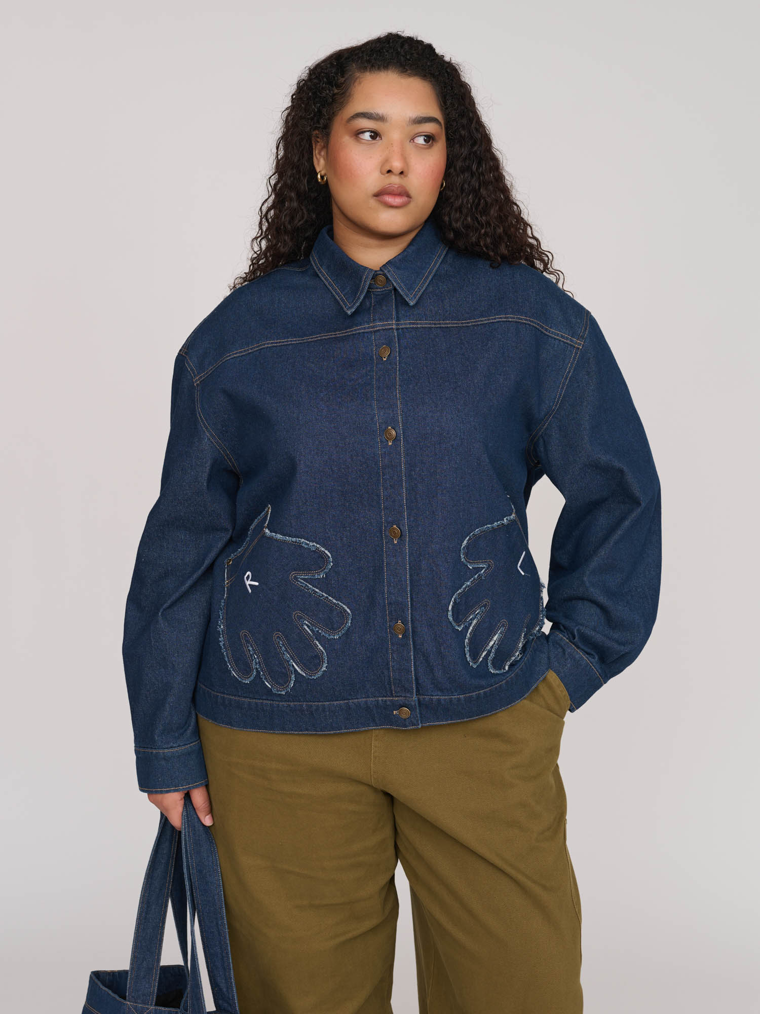 One of our loved skirt shapes, this midi length skirt has an elasticated waistband which has a functional drawcord to get the fit just right. In a deep blue, cotton blend denim, it features hand shaped pockets with the handiest (pardon the pun) embroidery ever - L and R on the left and right pockets. Match it up with our Out of Hand Denim Jacket and Tote, you’ll never forget your left ‘n’ rights again.
