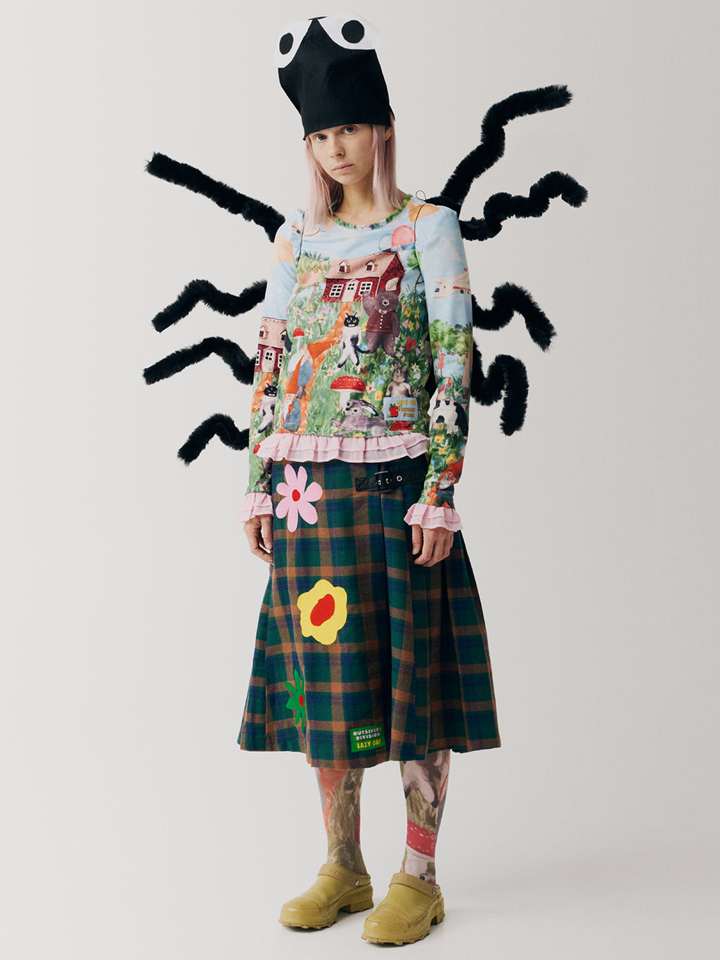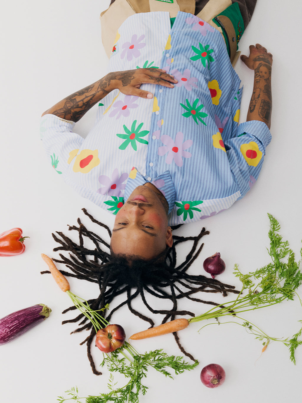 Designed in collaboration with Outsiders Division, this multi-pinstripe shirt has an oversized fit with back yoke and box pleat detail; paired with side slits at the hem, you’ve one super-flattering silhouette. It has a button down front and functional button cuffs then across the shirt are printed yellow, pink and green flowers. If skirts are more your vibe, you’ll definitely want to pair this with our Lazy Oaf X Outsiders Division Flower Bed Kilt. If not, how about our Oaf Fail Cropped Trousers?