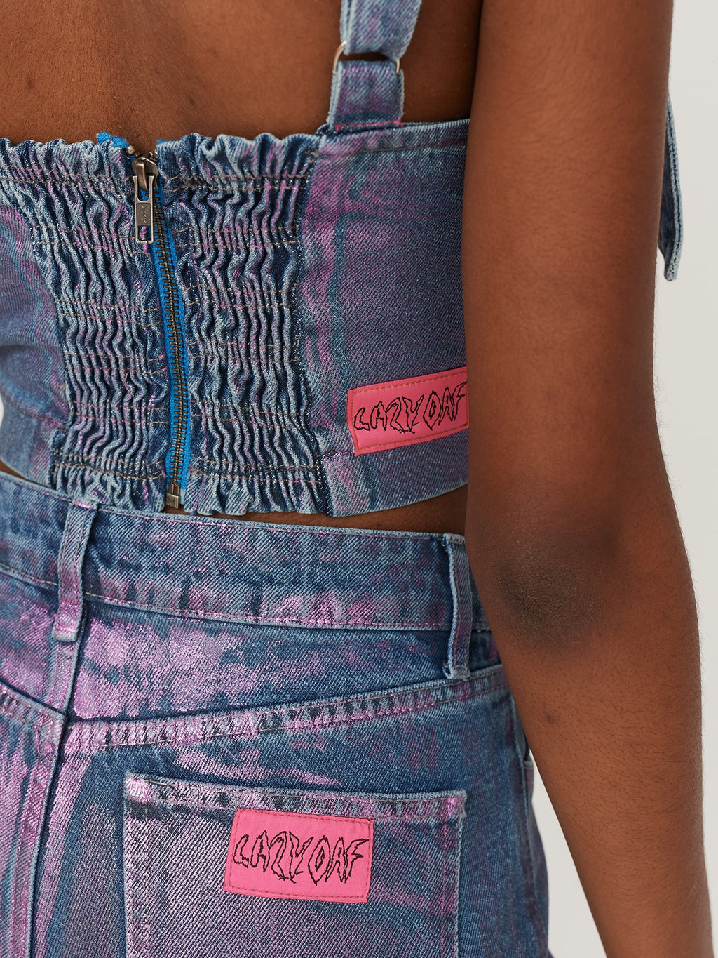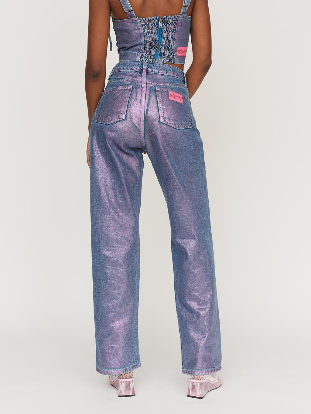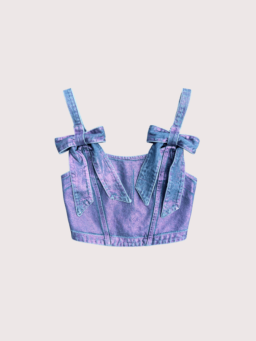 Made from 100% cotton, this panelled denim corset style top has a pink metallic foiled finish with differing effects, making each piece unique. In a cropped length with a fitted silhouette, the corset has twin bow detailing on the front, where the adjustable straps meet the bodice. The back has an elasticated shirred panel with an exposed silver zip and a branded pink woven label.