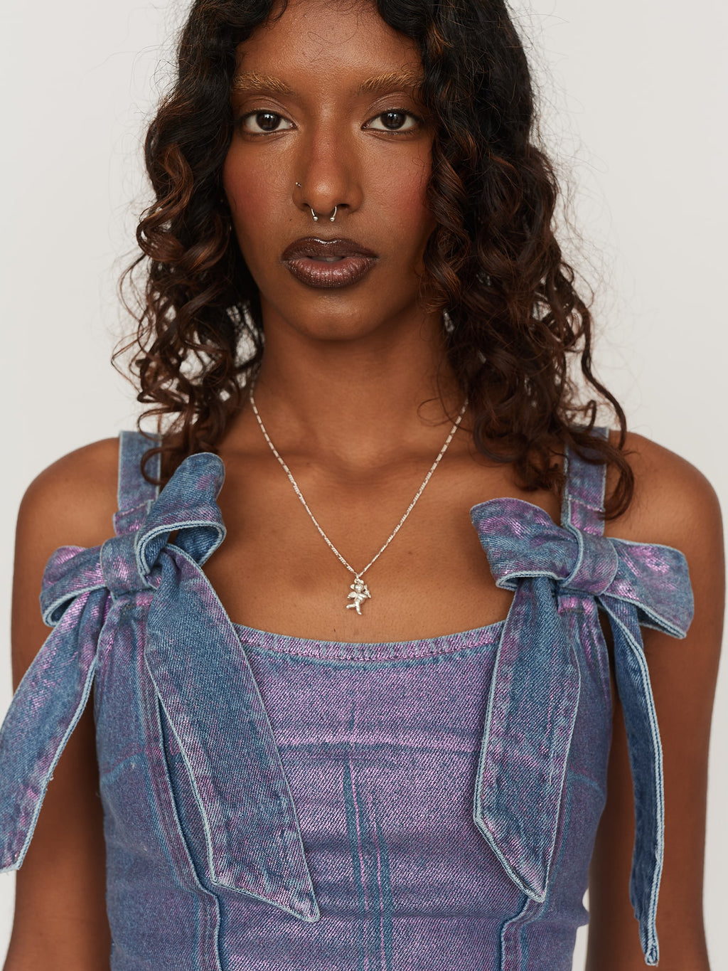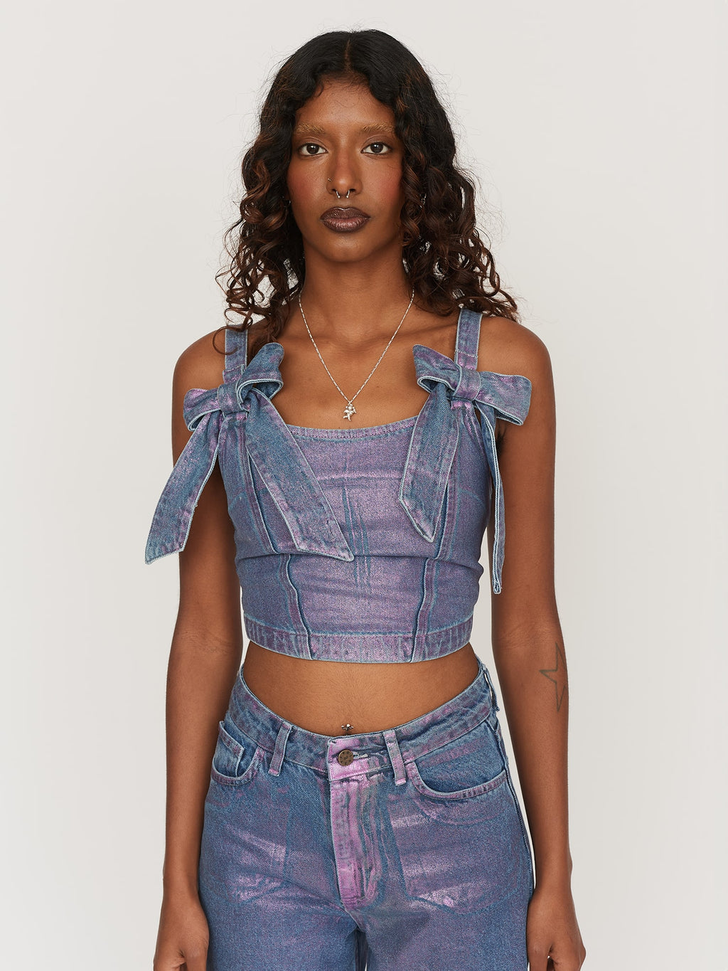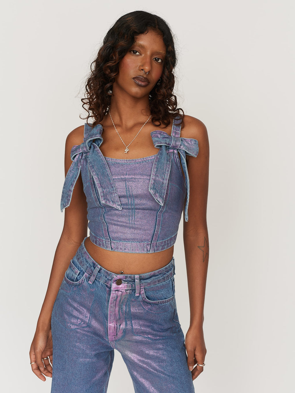 Made from 100% cotton, this panelled denim corset style top has a pink metallic foiled finish with differing effects, making each piece unique. In a cropped length with a fitted silhouette, the corset has twin bow detailing on the front, where the adjustable straps meet the bodice. The back has an elasticated shirred panel with an exposed silver zip and a branded pink woven label.