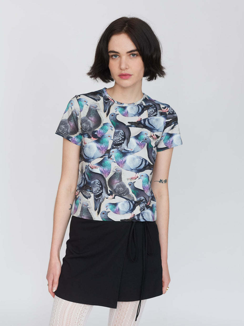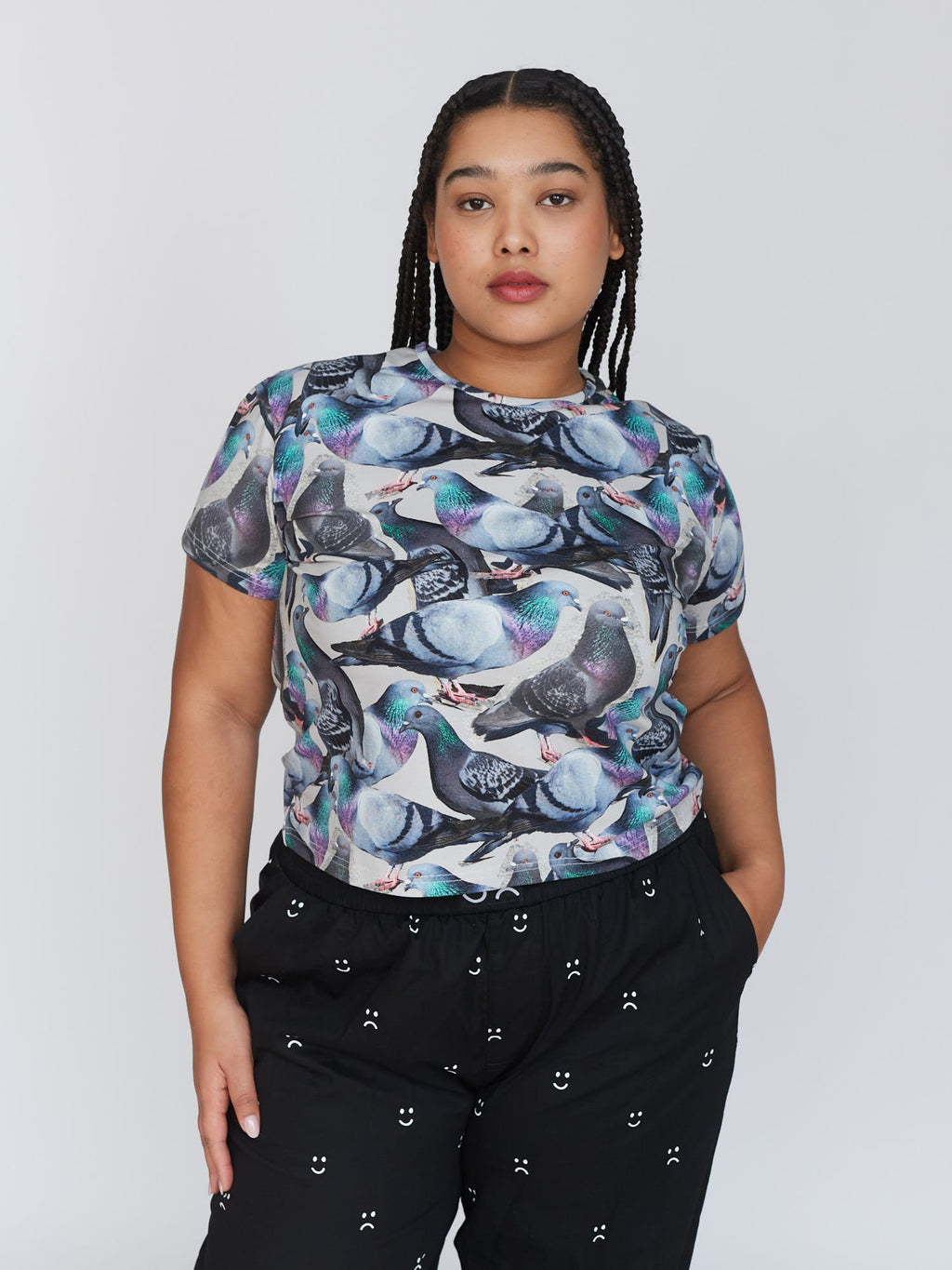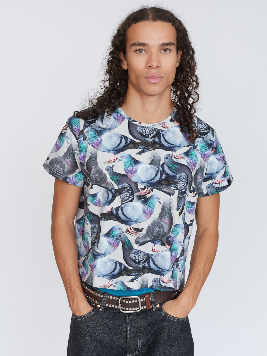 Our beloved fitted tee silhouette meets the underdog who deserves all the love. Made from a cotton elastane blend, this tee is true to size and has a slight cropped length. In an all over pigeon print, the greatest bird to have ever lived (after the Albatross from The Rescuers Down Under) it’ll look too coo-te with our Pigeons Are Pals Jeans.