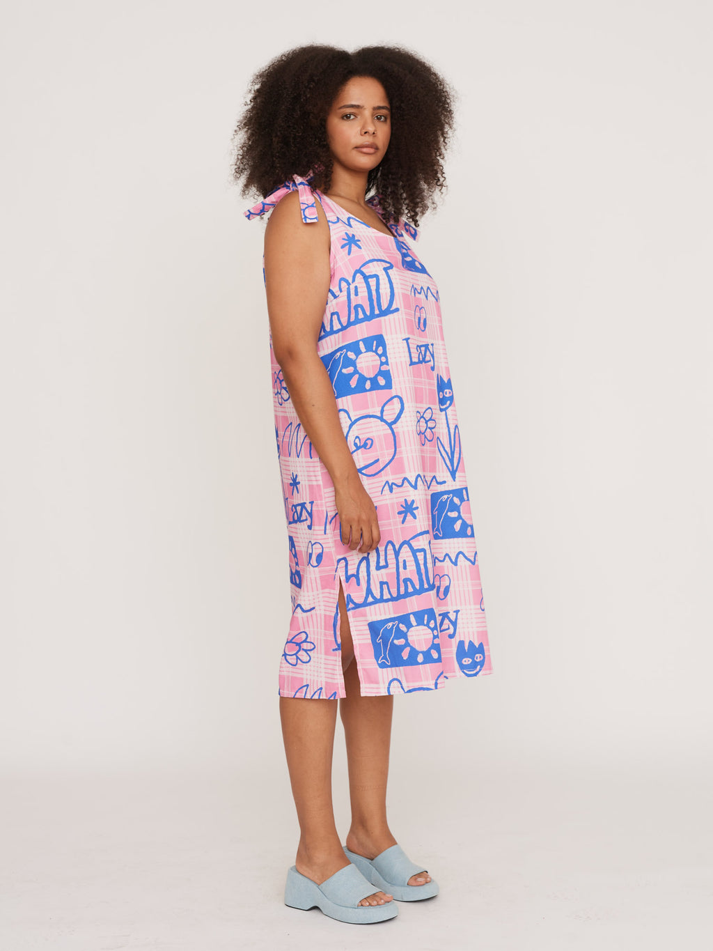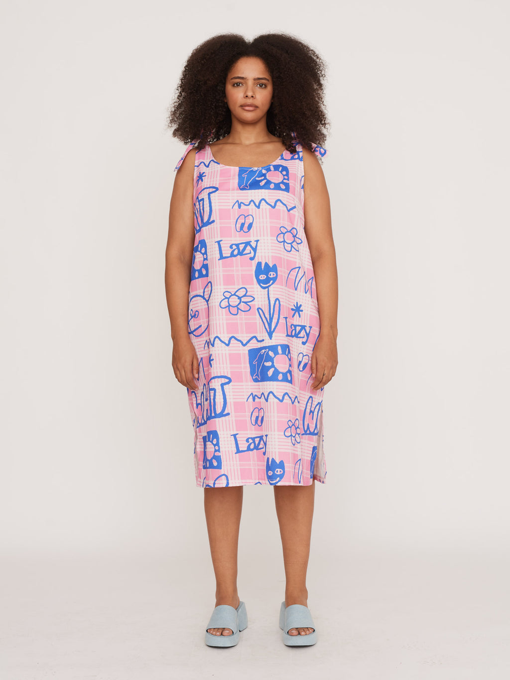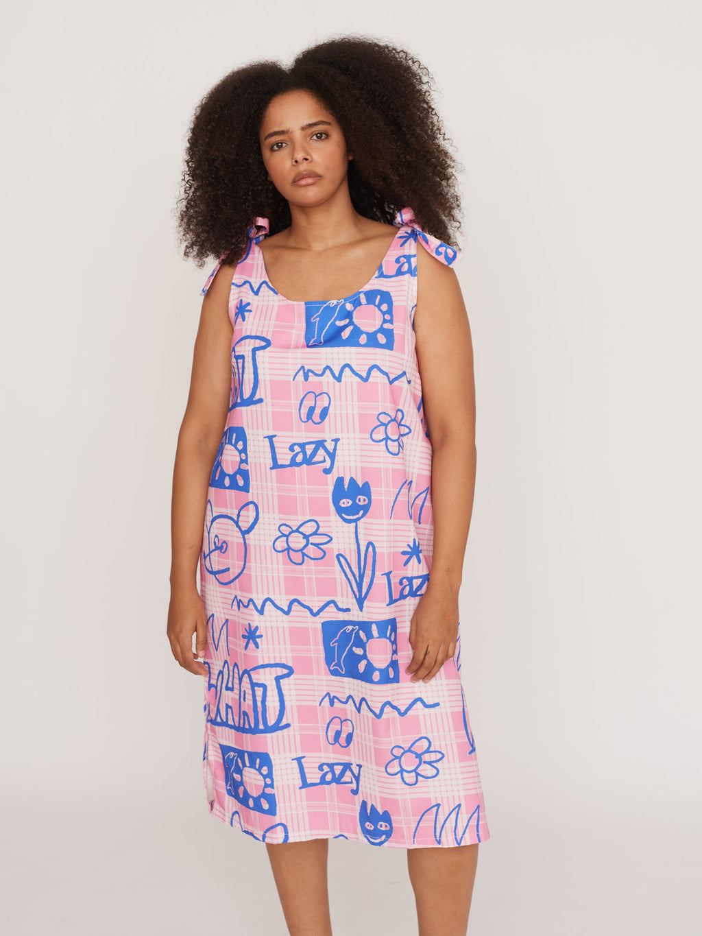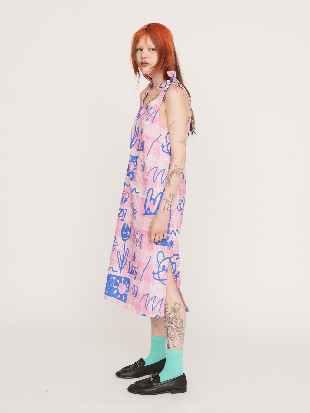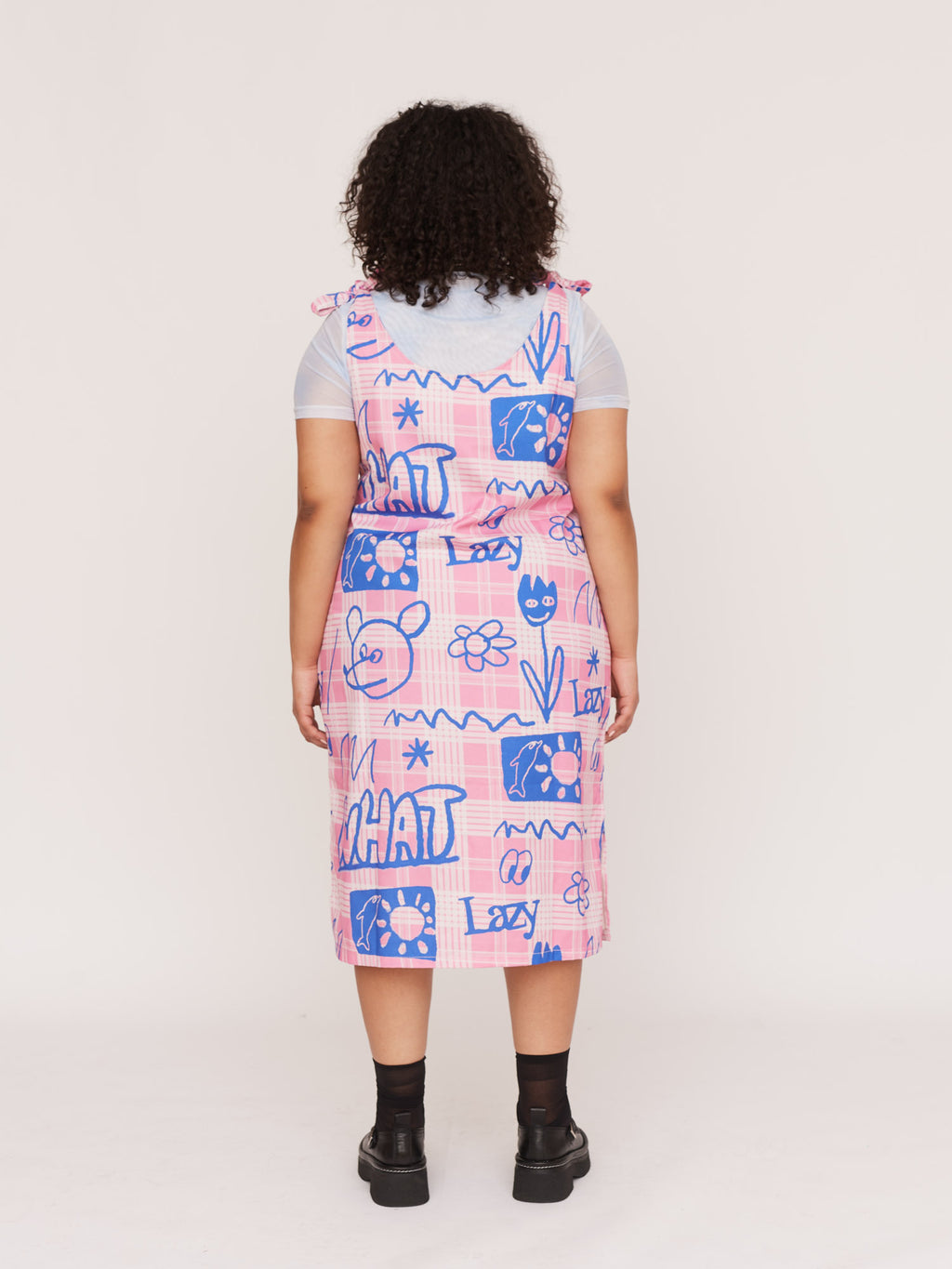 Can’t talk right now, I’m mourning my childhood aka when I would have six weeks off for summer. This relaxed dress is a brand new shape for us this year, ideal for summer or layering up in weird weather. Made from soft, 100% cotton, the piece moves really nicely and has functional tie shoulders which means you can adjust it according to your height. The pink check print also features doodles designed by our founder, Gem.
