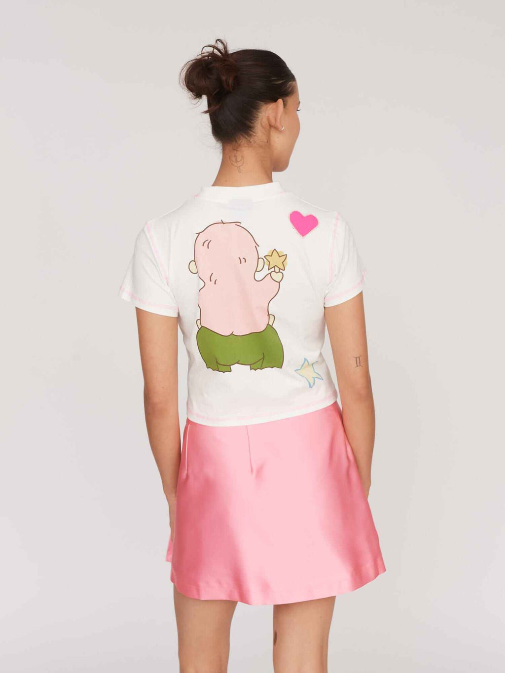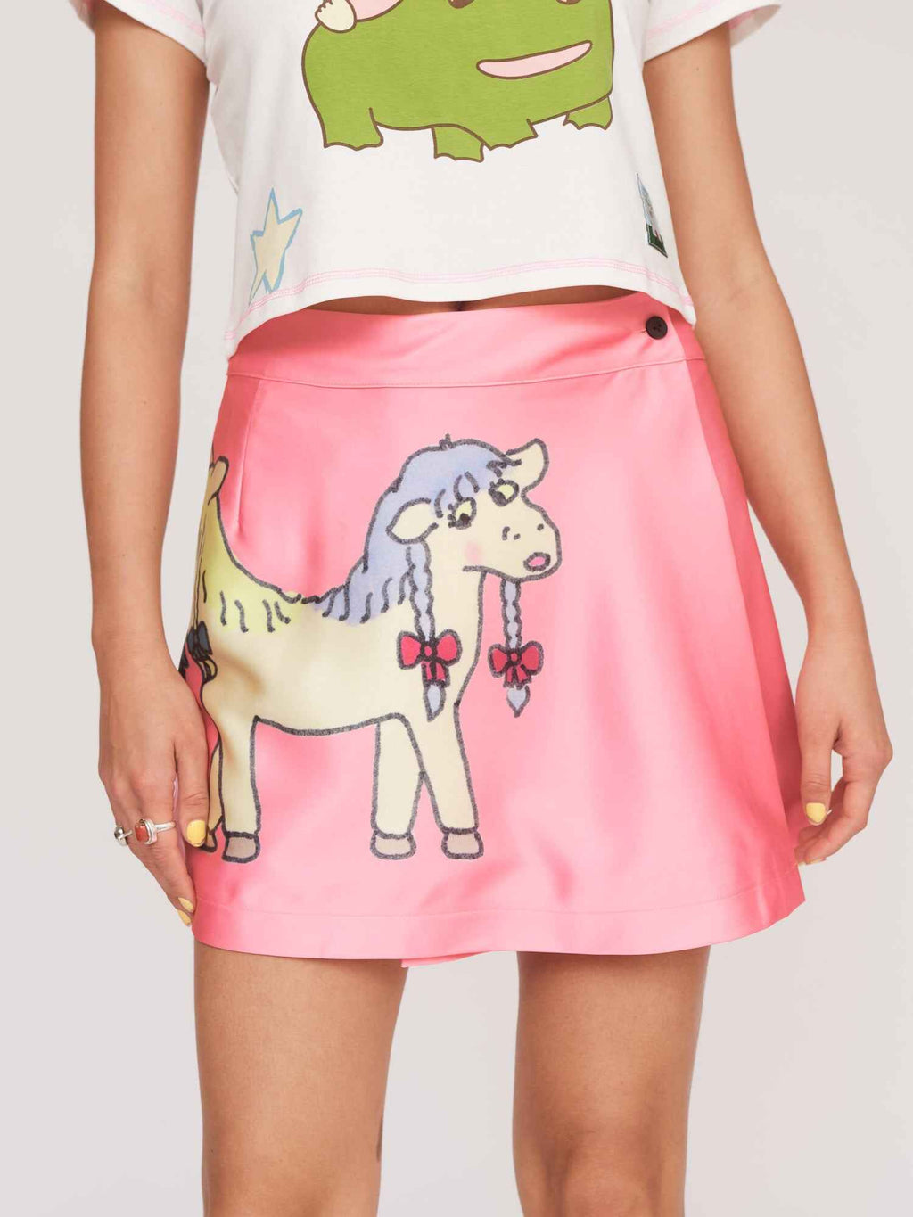 This mini skirt made from a pink satin material is fully lined with both an internal, and external, black button closure. On the side seam is a printed graphic by UK based illustrator Tom Jones. Go all pretty in pink with our Once Upon a Time Bow Top and Pink Lace Ballet Sneakers, or dial it back with a black baby tee and Happy Sad Lace Up Ballet Sneakers.