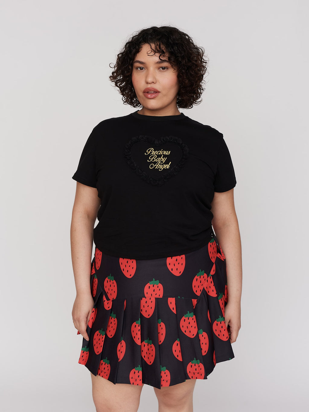 Our classic fitted baby tee shape is made from a cotton-elastane blend and has a slightly cropped length. On the chest is a black lace heart with ‘Precious Baby Angel’ embroidered in gold in the centre, and at the cuff is an Oaf pip label. Get ready to rave by styling it with our Lazy Pup Mini Skirt and Black Ballet Sneakers.