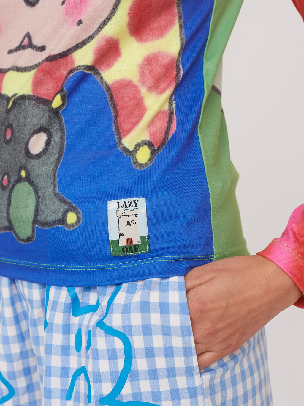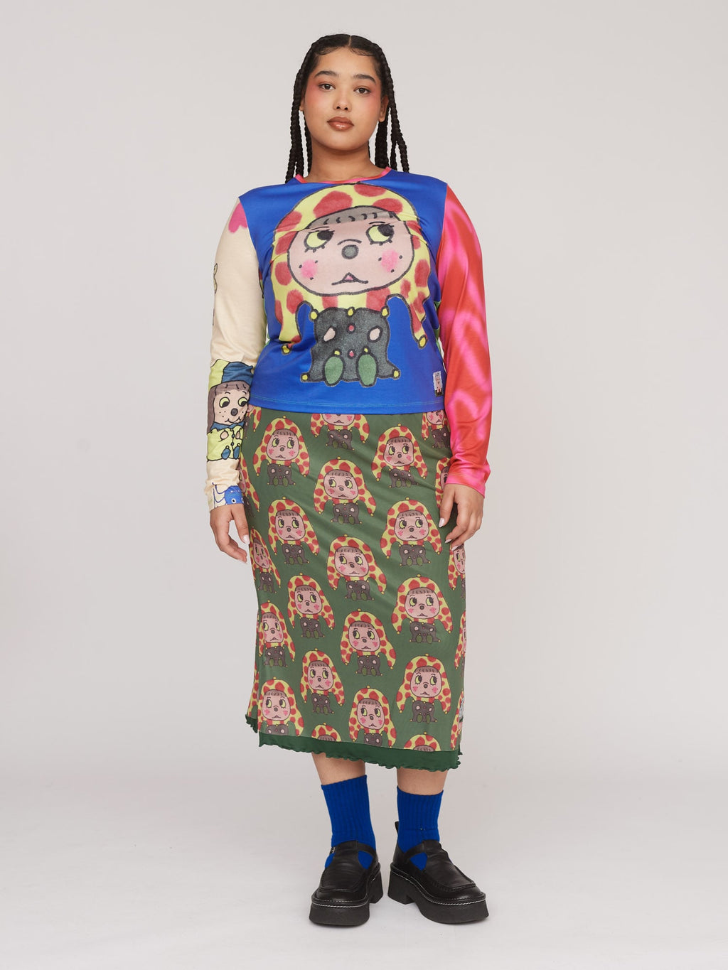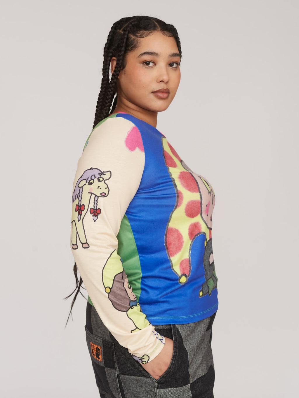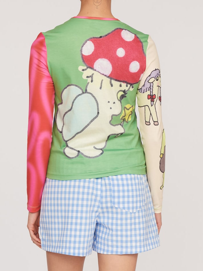 This fitted long sleeve features contrasting prints on the front, back and sleeves with character graphics created by illustrator Tom Jones, @tomjones92_. The neck has contrast self-fabric neck binding, and at the hem is woven patch label in keeping with our Once Upon a Time collection. In a lightweight material, that has a slight stretch, and it’ll look perfect layered under a tee or worn alone.
