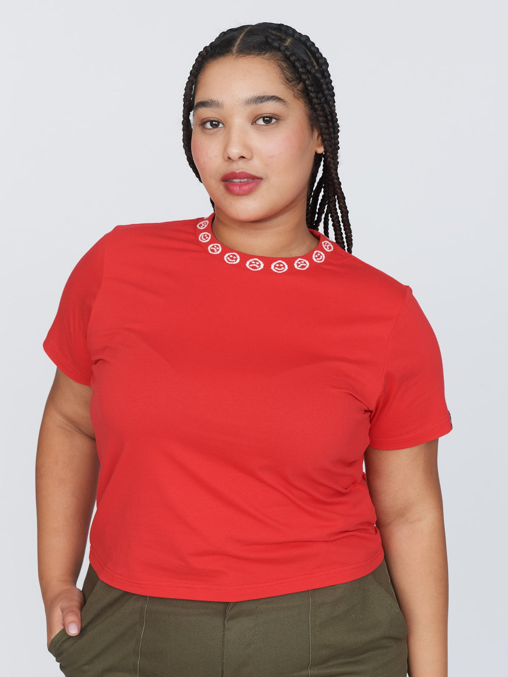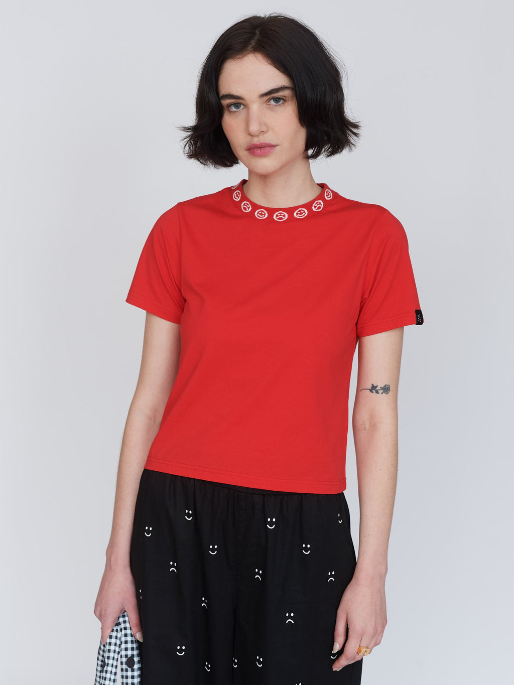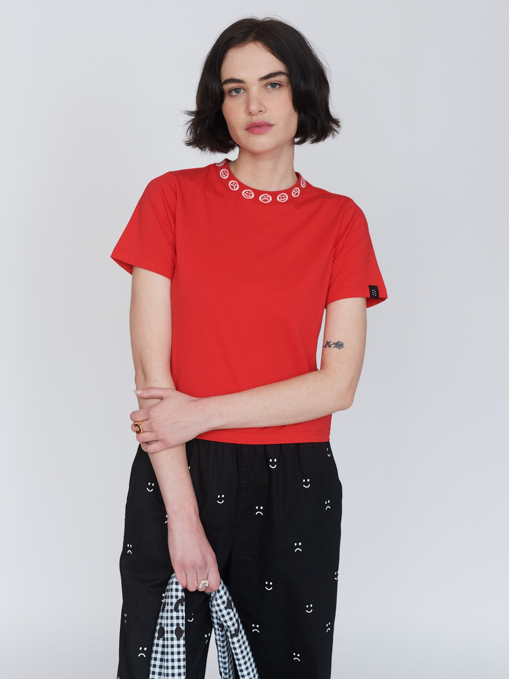 Our beloved fitted tee is made from a cotton elastane blend with a true to size fit, and has a slight cropped length. In red, it has a jacquard ribbed neck trim with our iconic Happy Sad print in contrasting white; it’s the ideal everyday t-shirt.