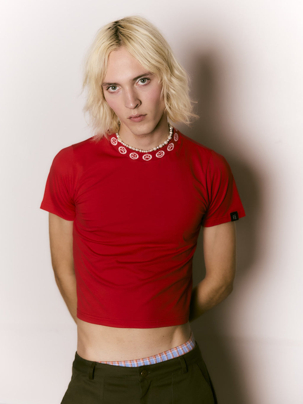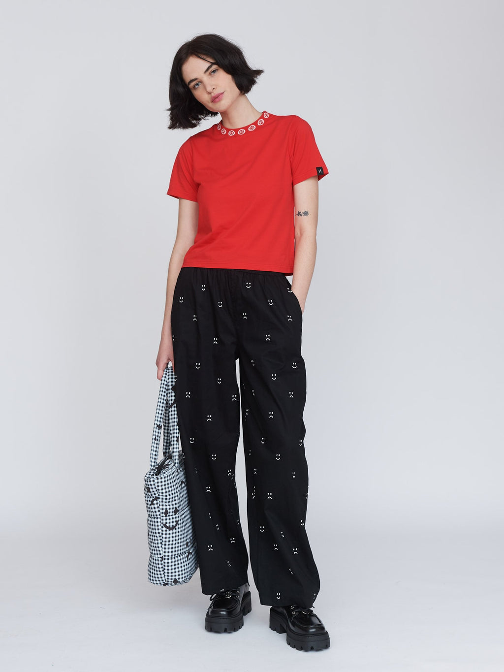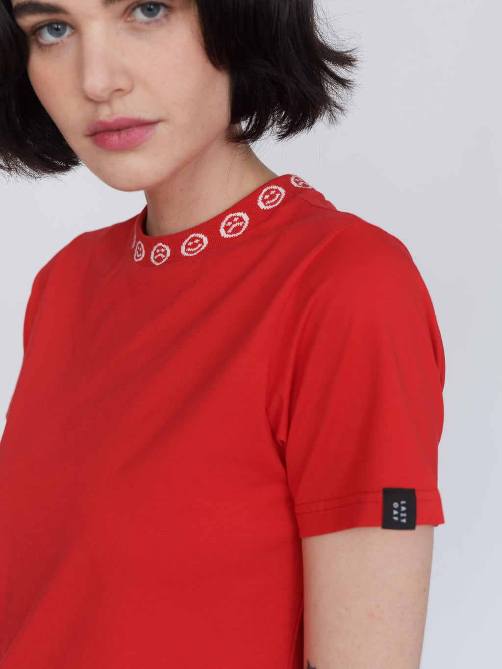 Our beloved fitted tee is made from a cotton elastane blend with a true to size fit, and has a slight cropped length. In red, it has a jacquard ribbed neck trim with our iconic Happy Sad print in contrasting white; it’s the ideal everyday t-shirt.