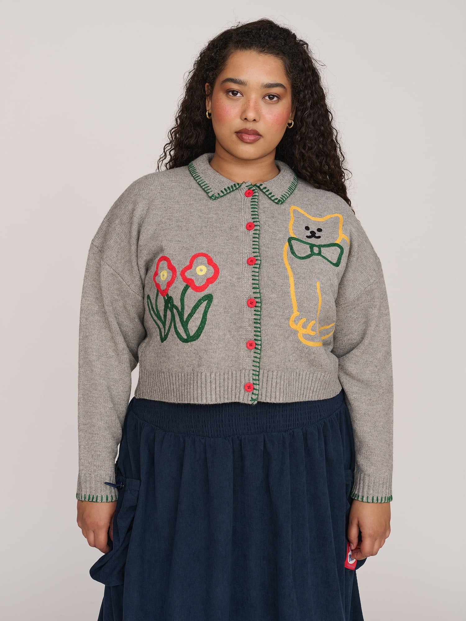 In 100% cotton, this long sleeve, smock mini dress has a crew neck with a back tie closure. In a deep red, it has full sleeves with adjustable tie closures at the cuff and a full, gathered skirt which of course, has side seam pockets. Featuring an all over print of the most dapper cat you’ll ever see drawn by illustrator, Zoey Kimm, this’ll be a staple for your winter wardrobe.