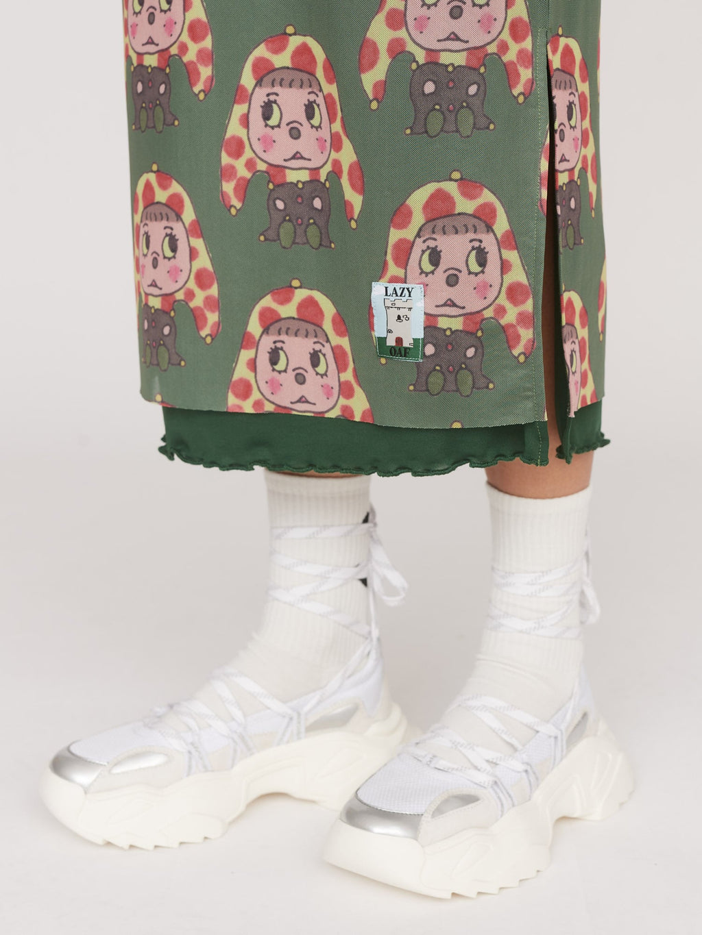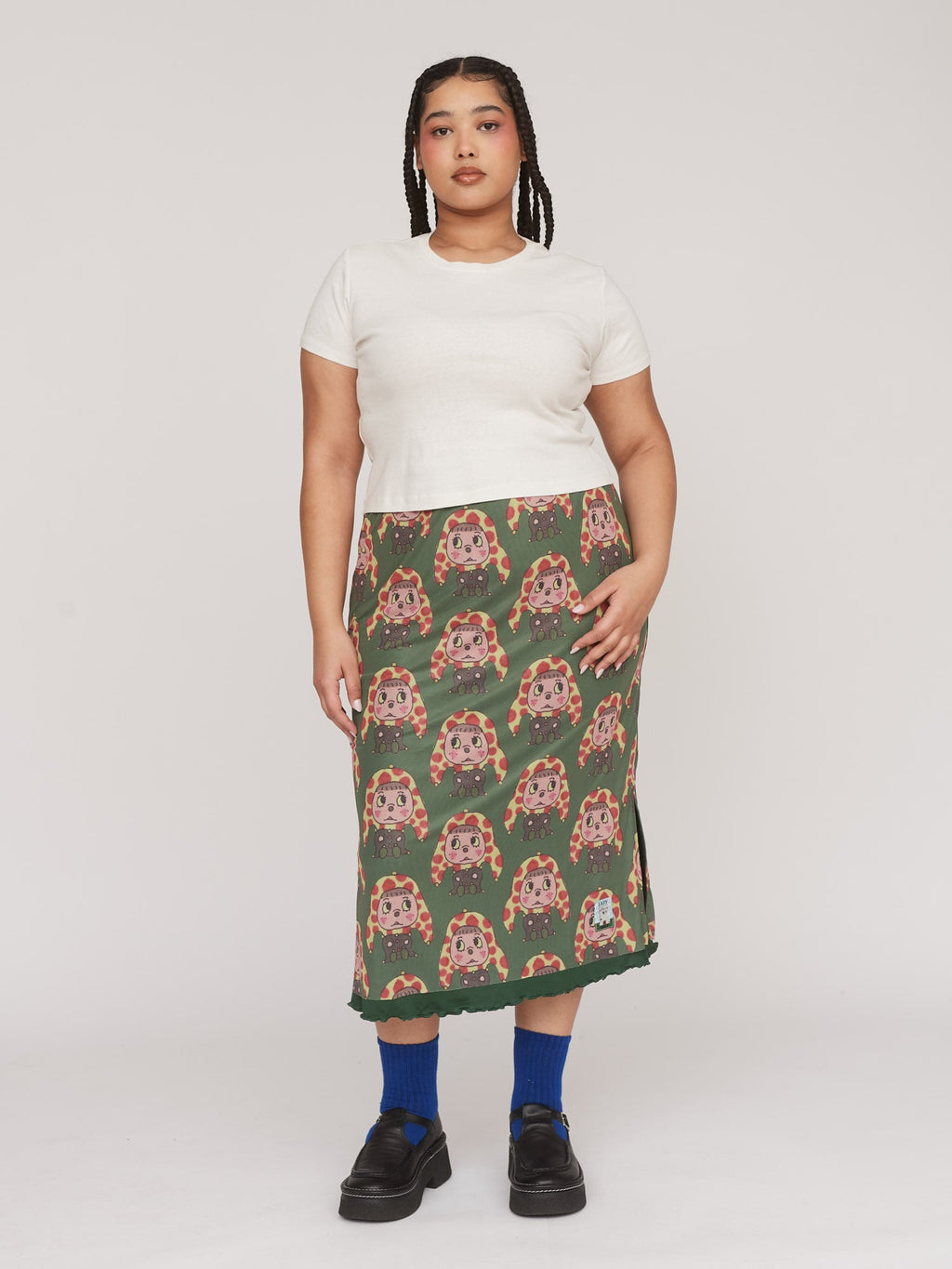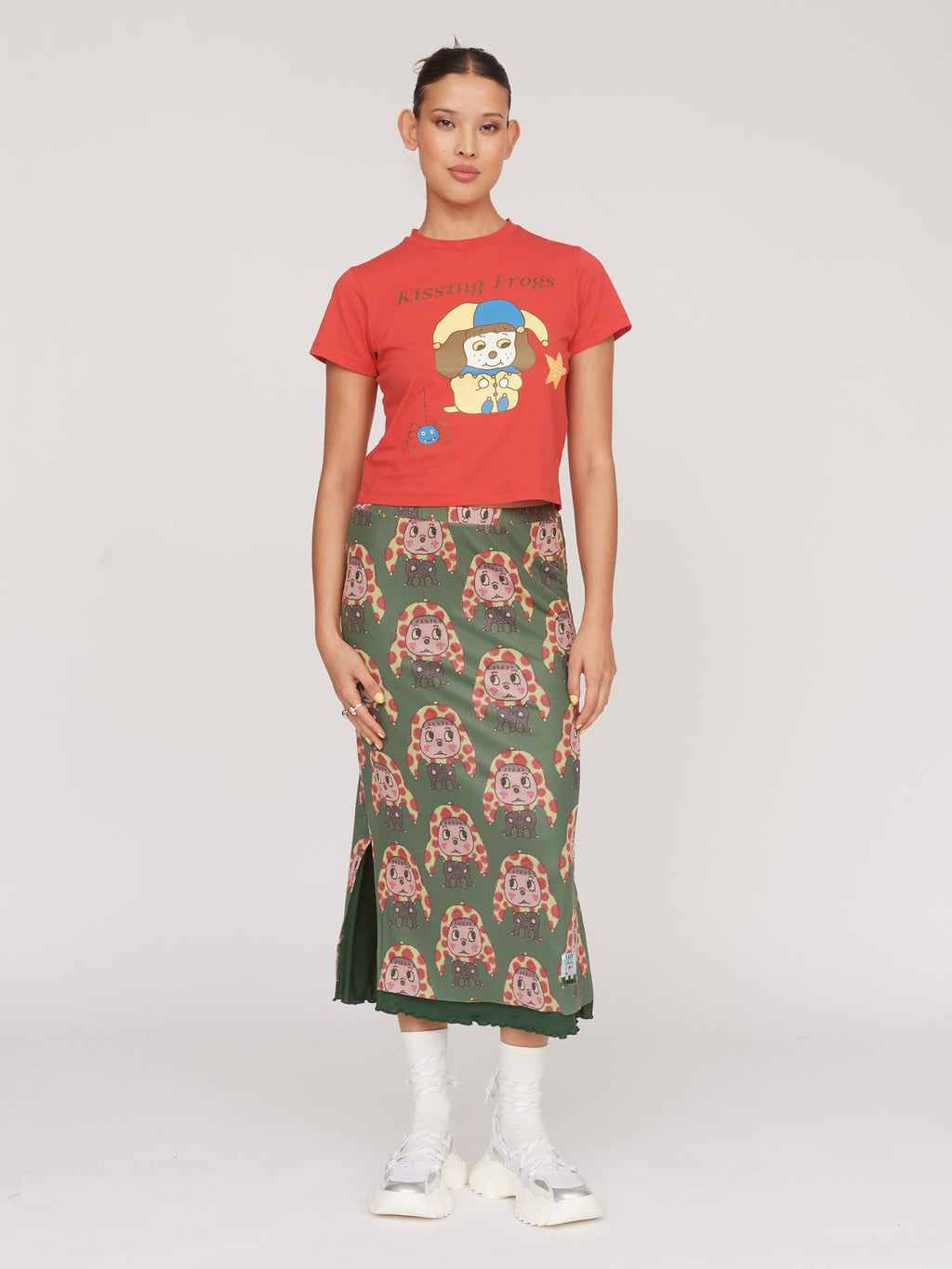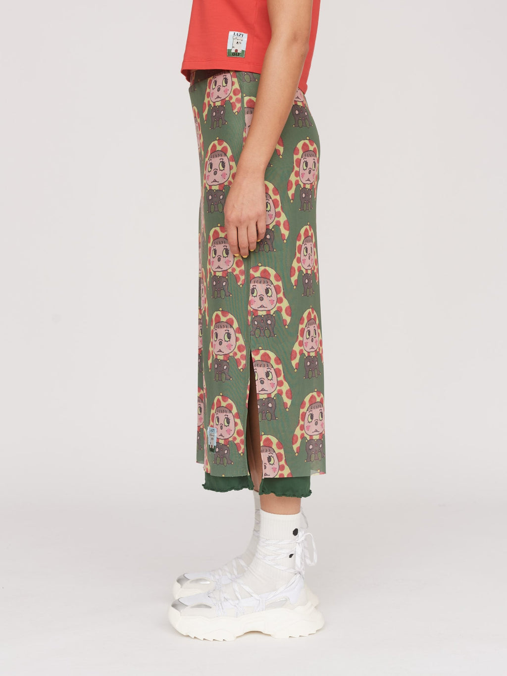 Falling at midi length, this mesh skirt is the perfect piece for looking put together, but feeling super comfy. Across the garment is an all over digital print featuring a jester character drawn by illustrator Tom Jones, @tomjones92_. No need to worry about feeling like everyone can see your pants, as there’s a dark green lining that finishes with a lettuce edge hem. There are side seam splits, along with an elastic waistband, adding to the ease.