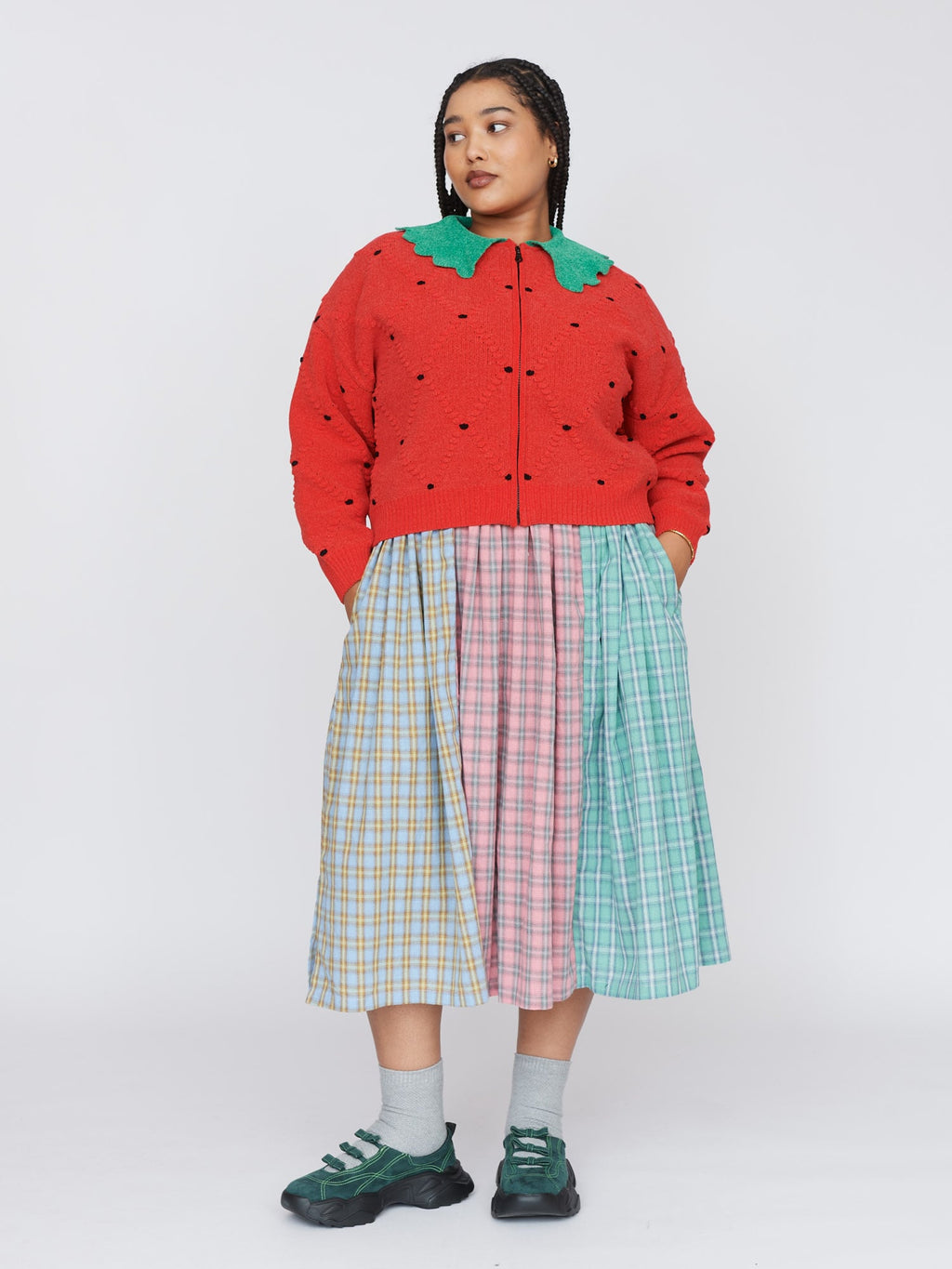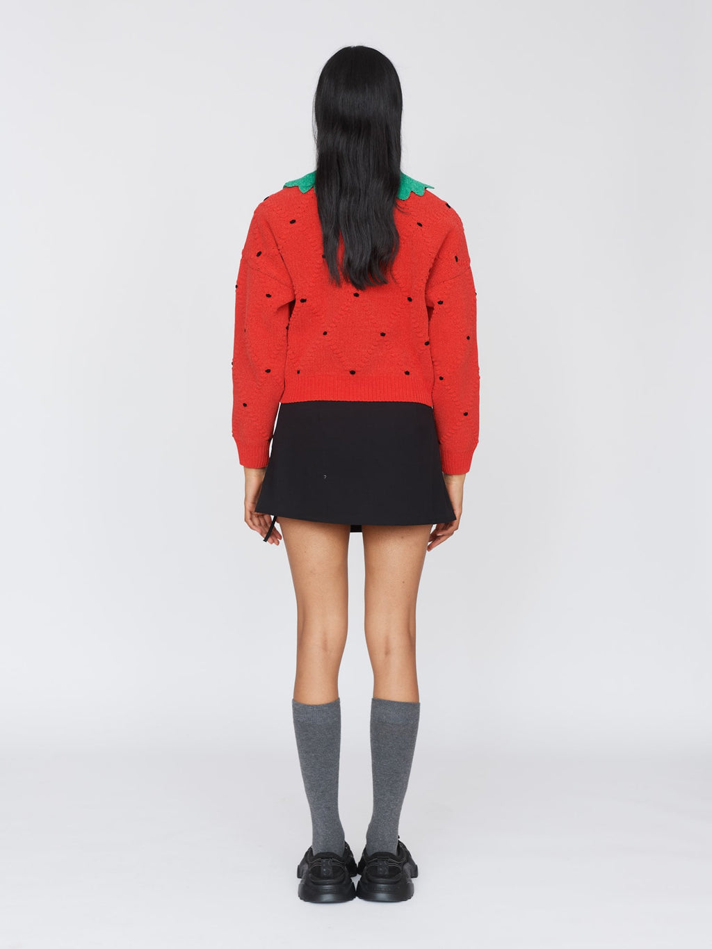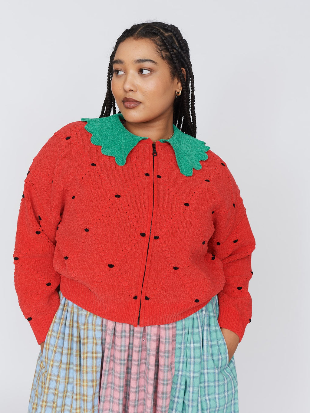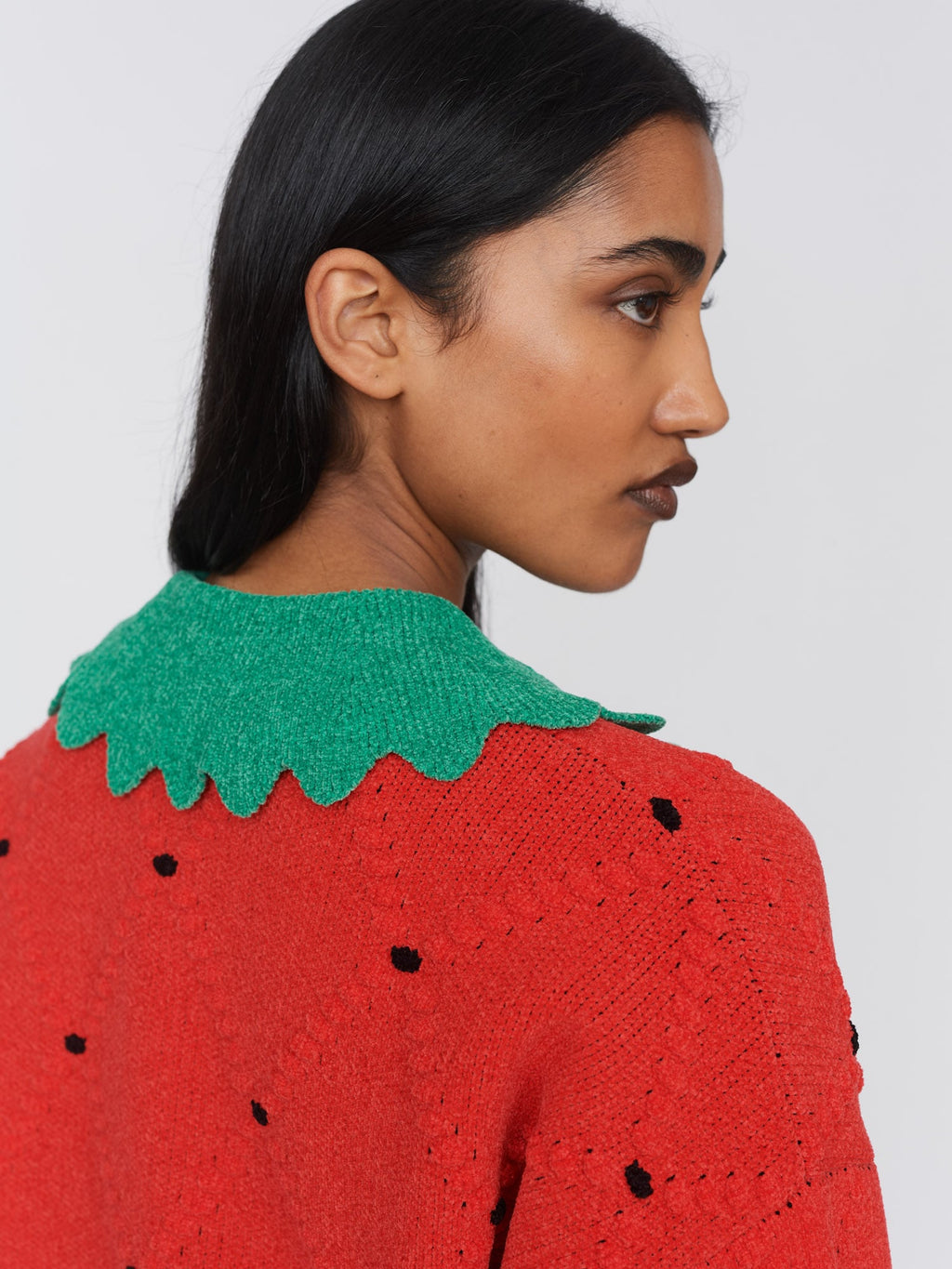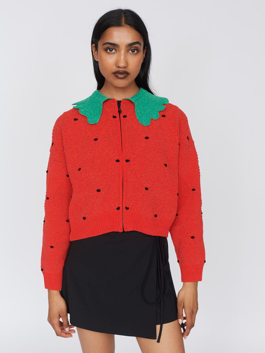 In a boxy fit, this red textured knit cardigan features a diagonal design joined by black pompoms to create the strawberry look. No strawb is complete without its signature leaf, so the green collar has a scalloped edge to give the effect. The cardigan is fastenable by a zip front closure and has both ribbed cuffs, and hem. You’re gonna be top of the fruit bowl in this cosy number.
