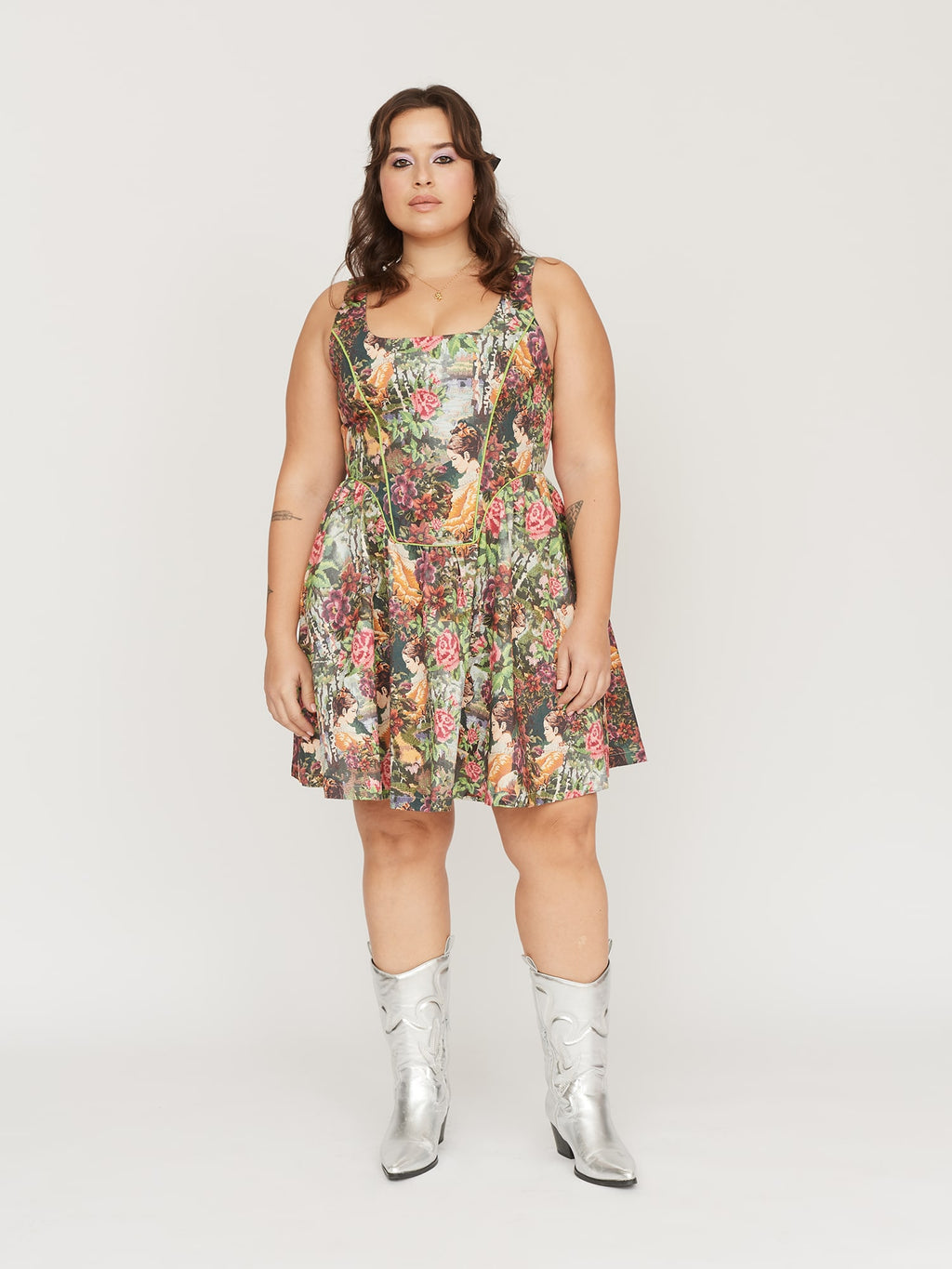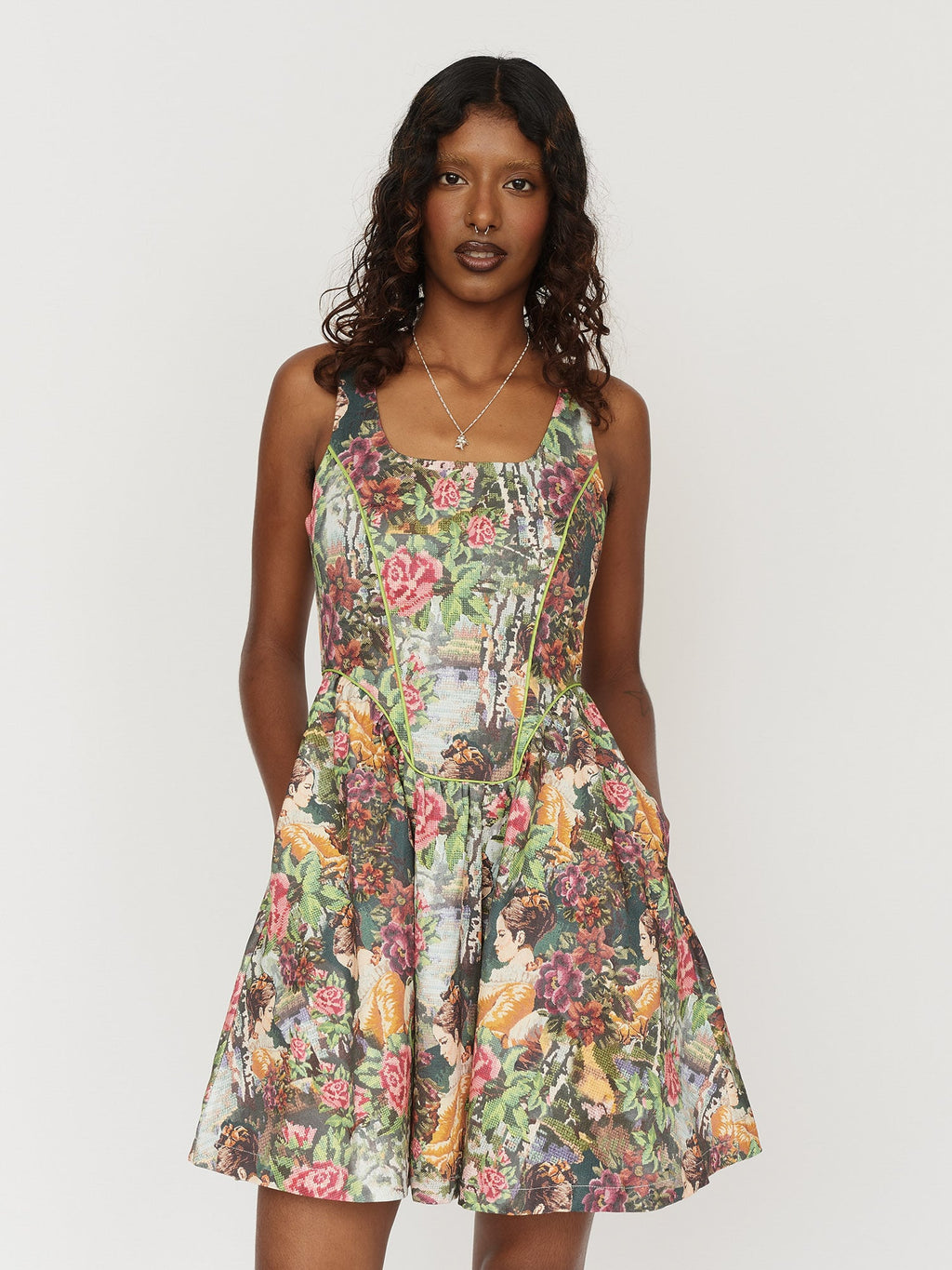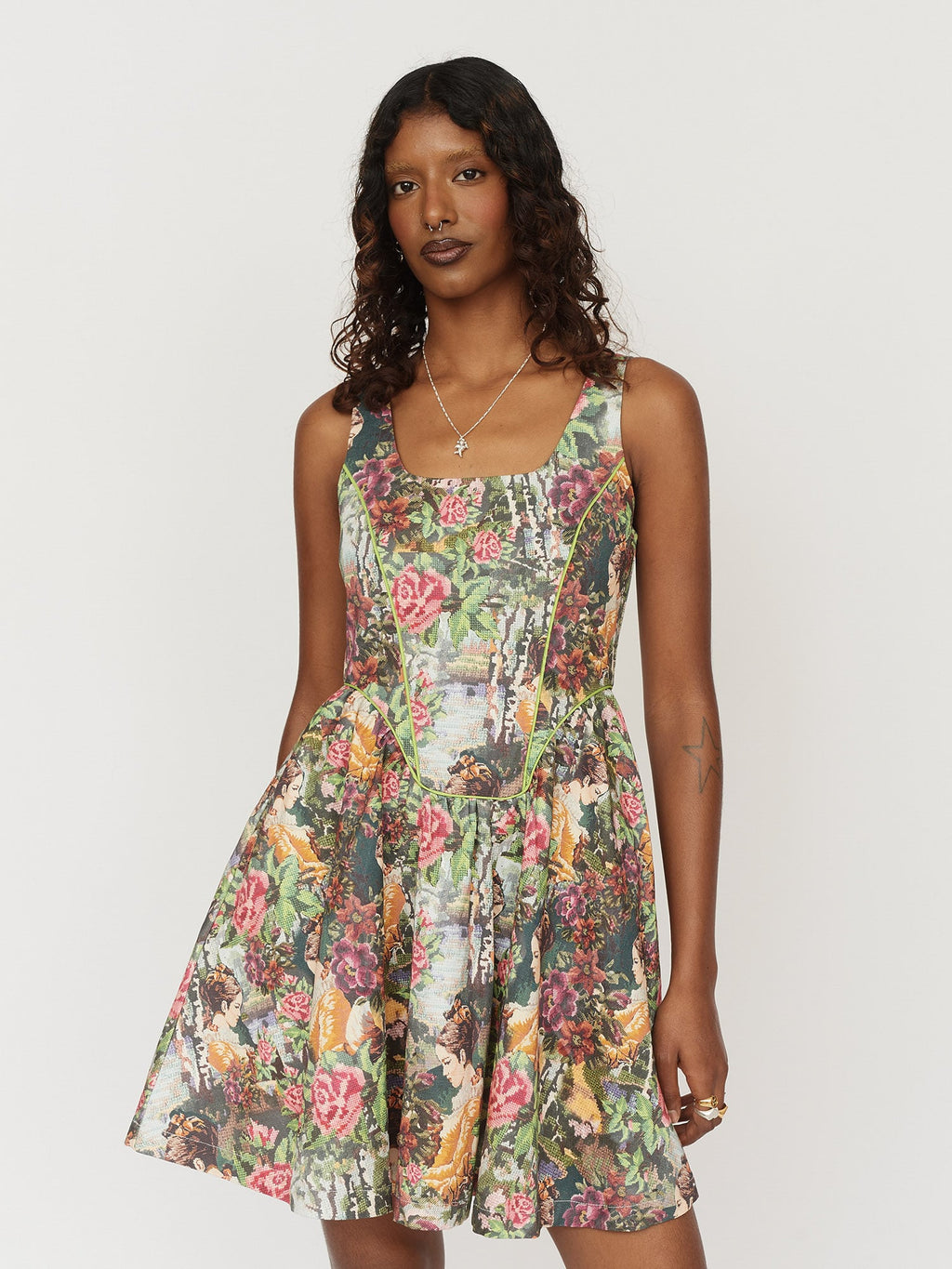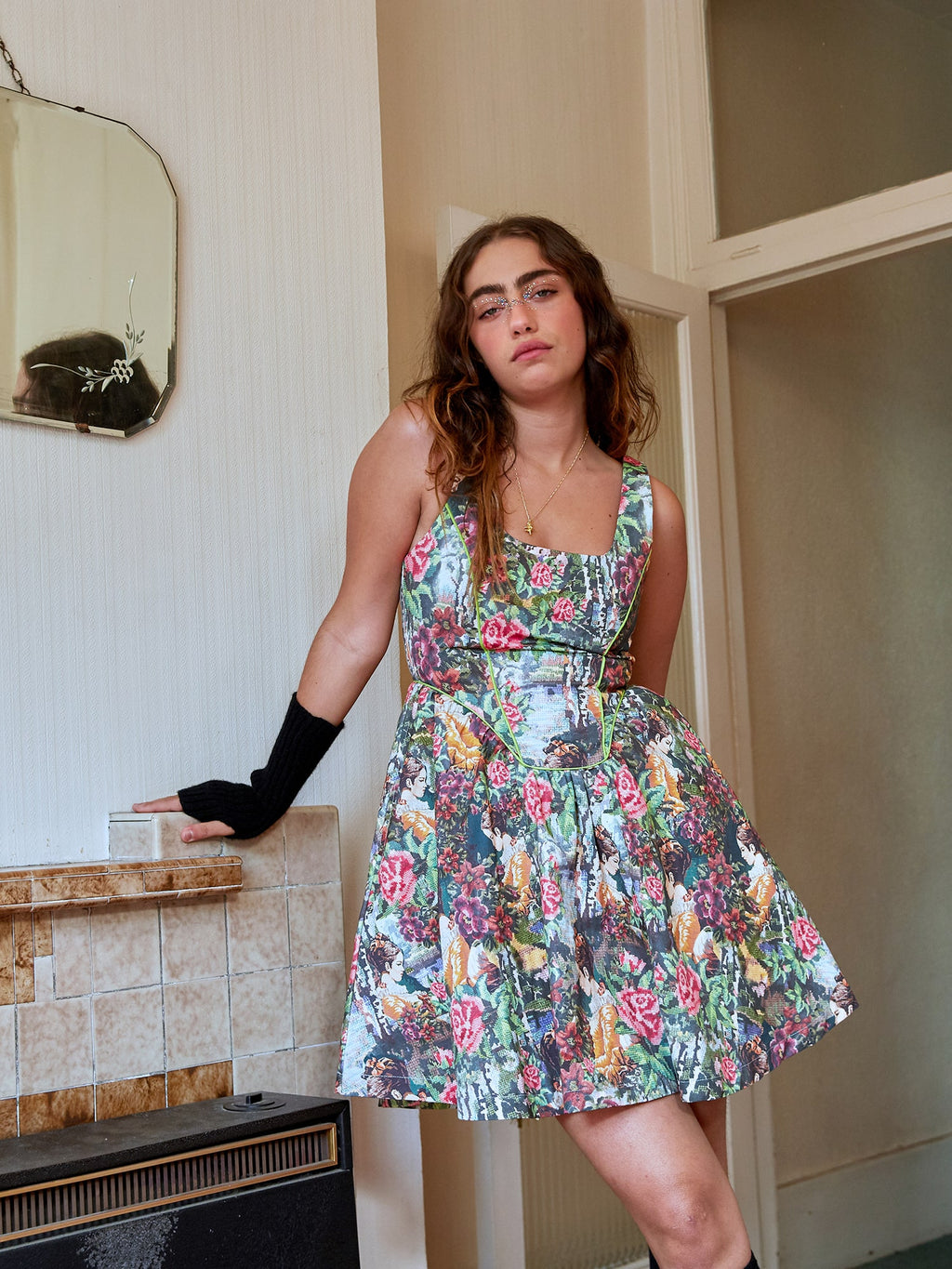 This mini length dress has a fitted corset style bodice with lime green contrast piping that goes into a full skirt. It’s in an all over tapestry print with a varying placement from piece to piece, making each unique. There are side seam pockets, and the dress is fastened by a concealed zip at the centre back.