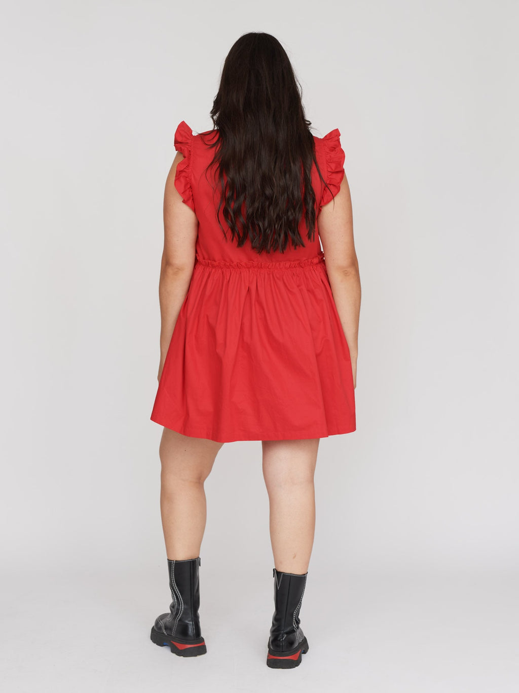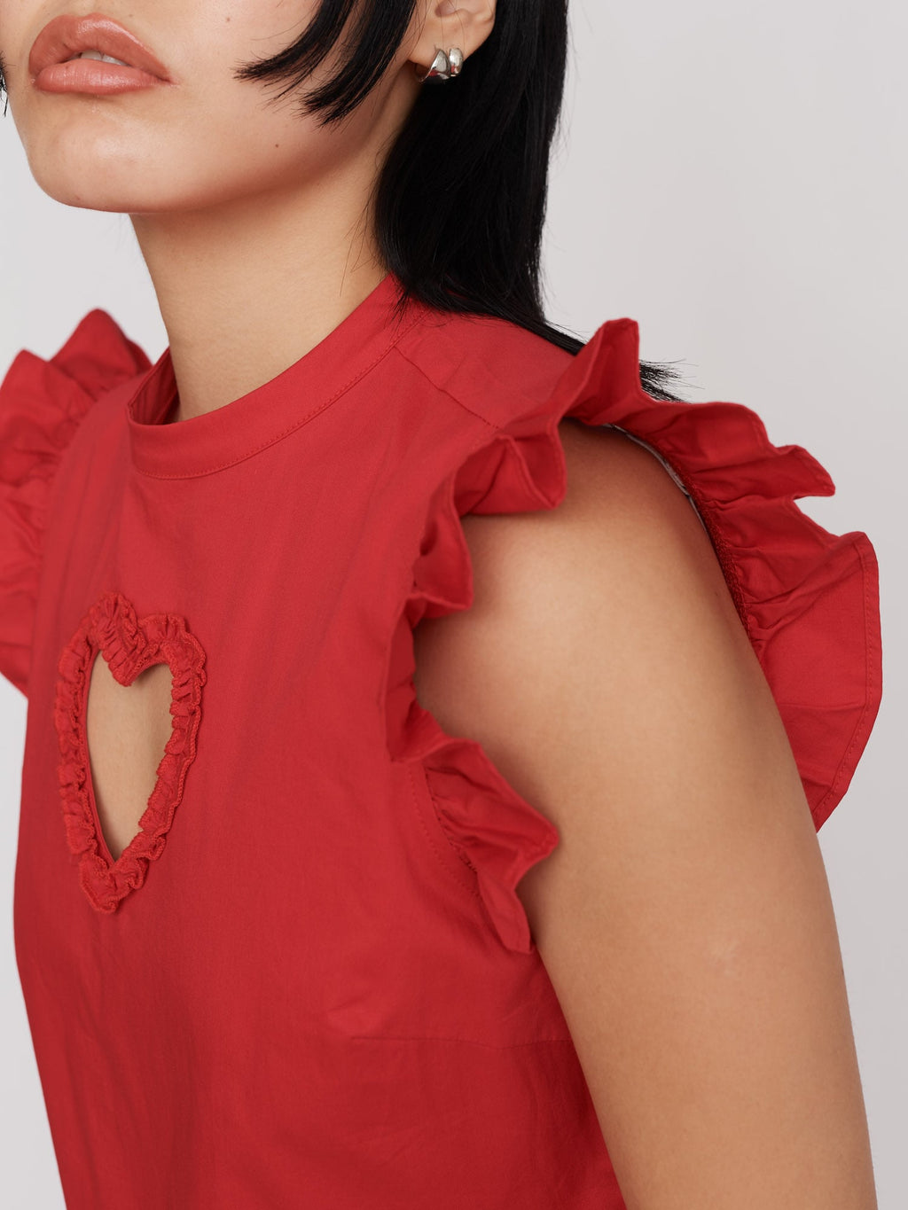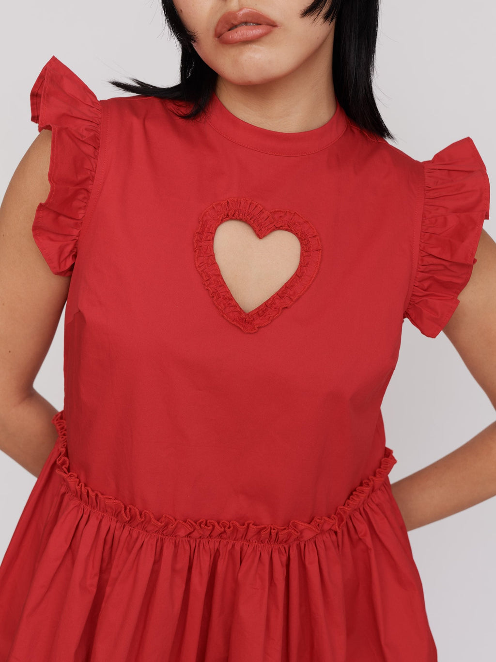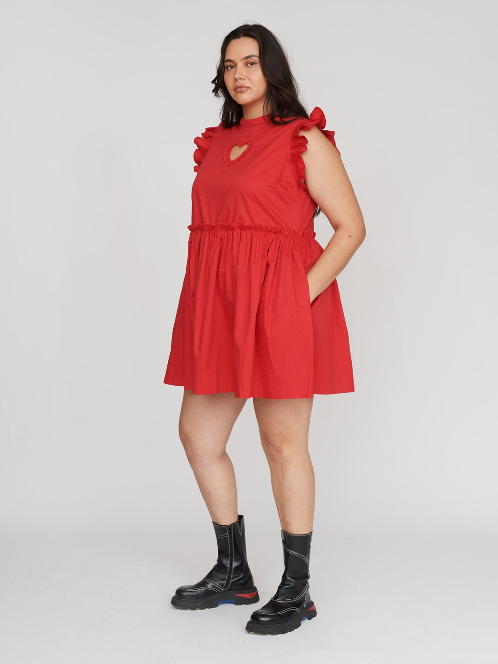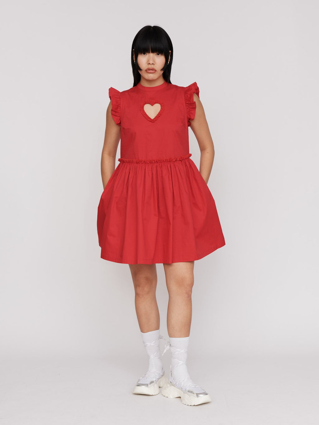 In 100% cotton, this lightweight mini dress is in a cherry red colour, and has a heart cut out with a ruffle edge at the centre of the chest. The shoulders, as well as where the bodice meets the full skirt, also have a ruffle detailing. The dress has a concealed zipper down the back and of course, has side seam pockets. Style with your fave statement white socks and our White Ballet Sneakers for a summer look ready for all occasions.