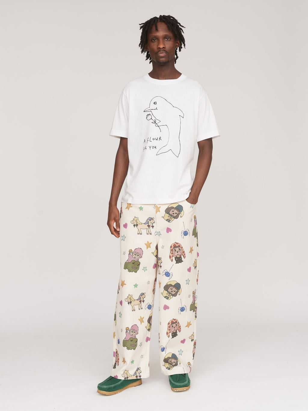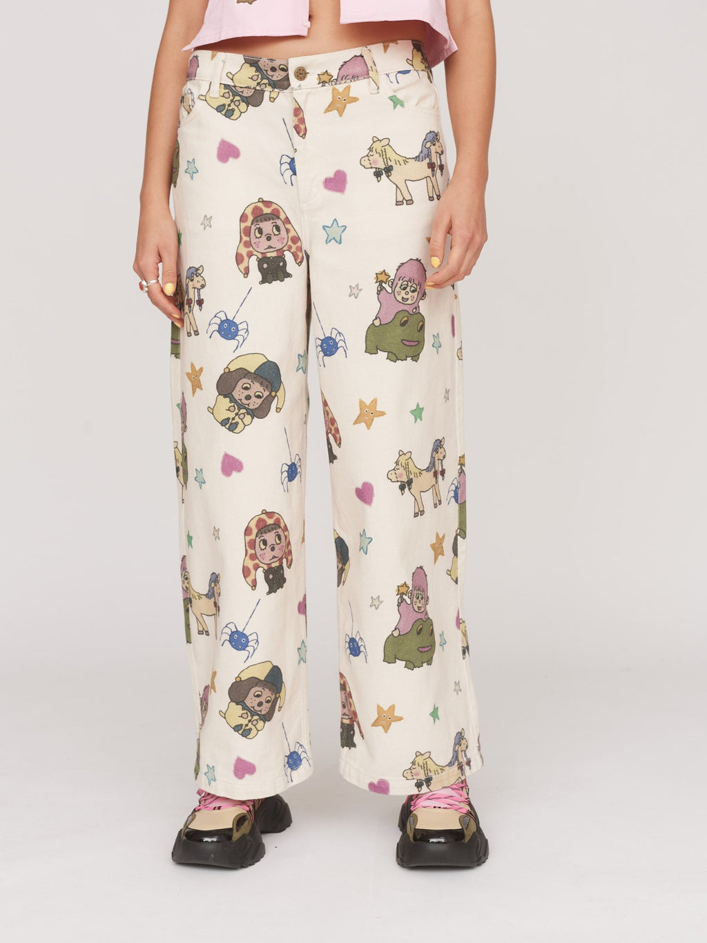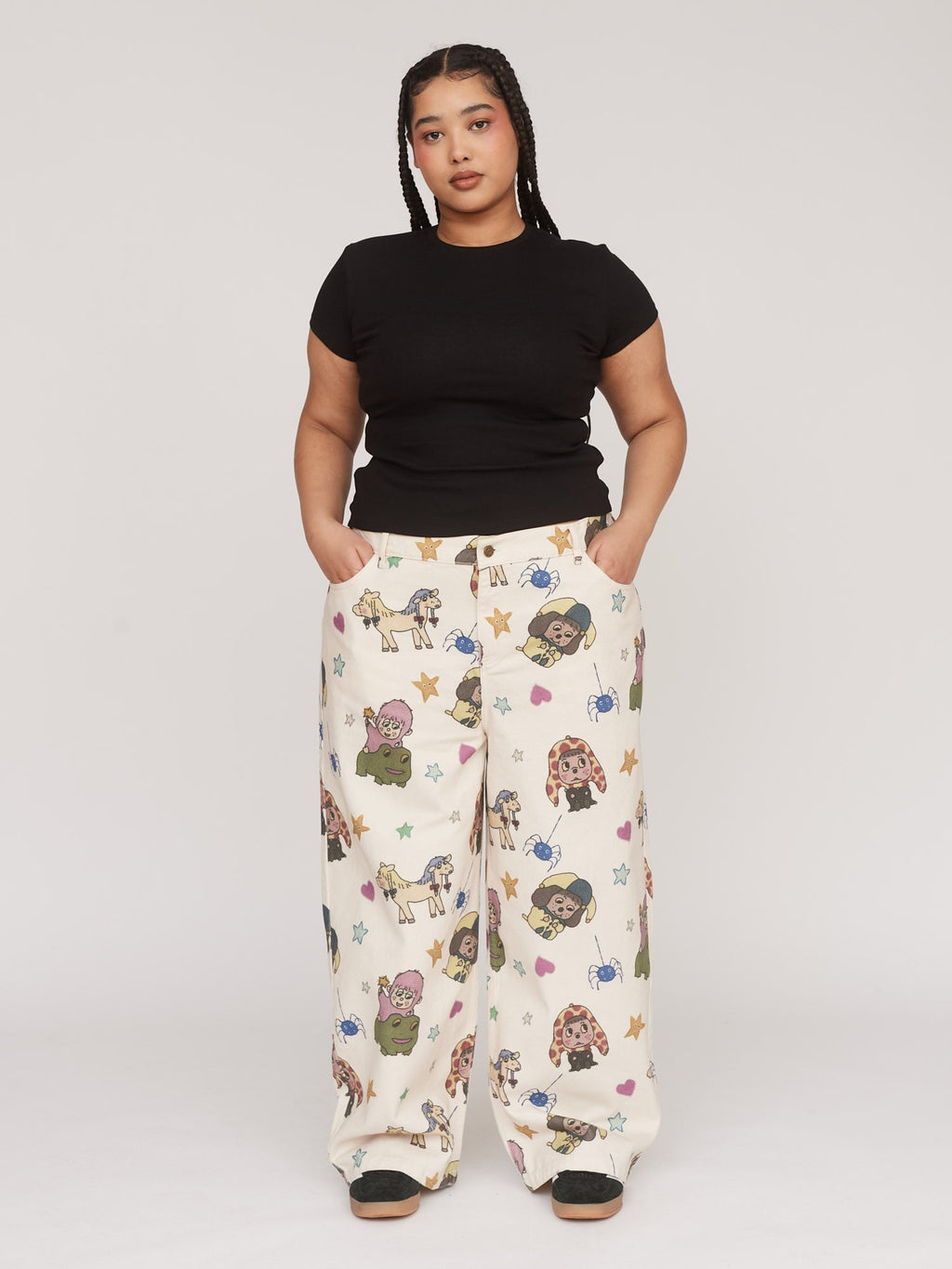 Sitting at mid-rise, they have an elasticated back waistband with a zip fly closure; if you’re in-between sizes we recommend sizing down due to the stretch from the elastic. They have both hip and back patch pockets along with a jacron paper patch on the back of the waistband. Pairing perfectly with the Unhappy Endings Twill Chore Jacket, they have an all over print done by illustrator Tom Jones.