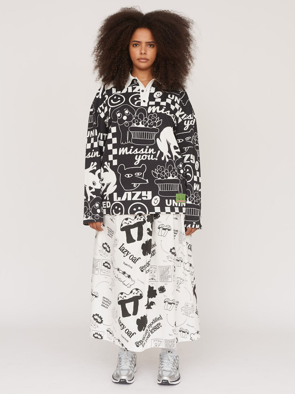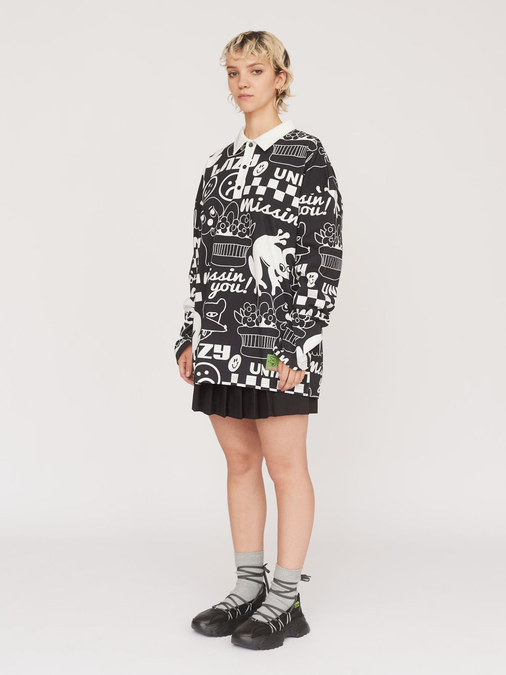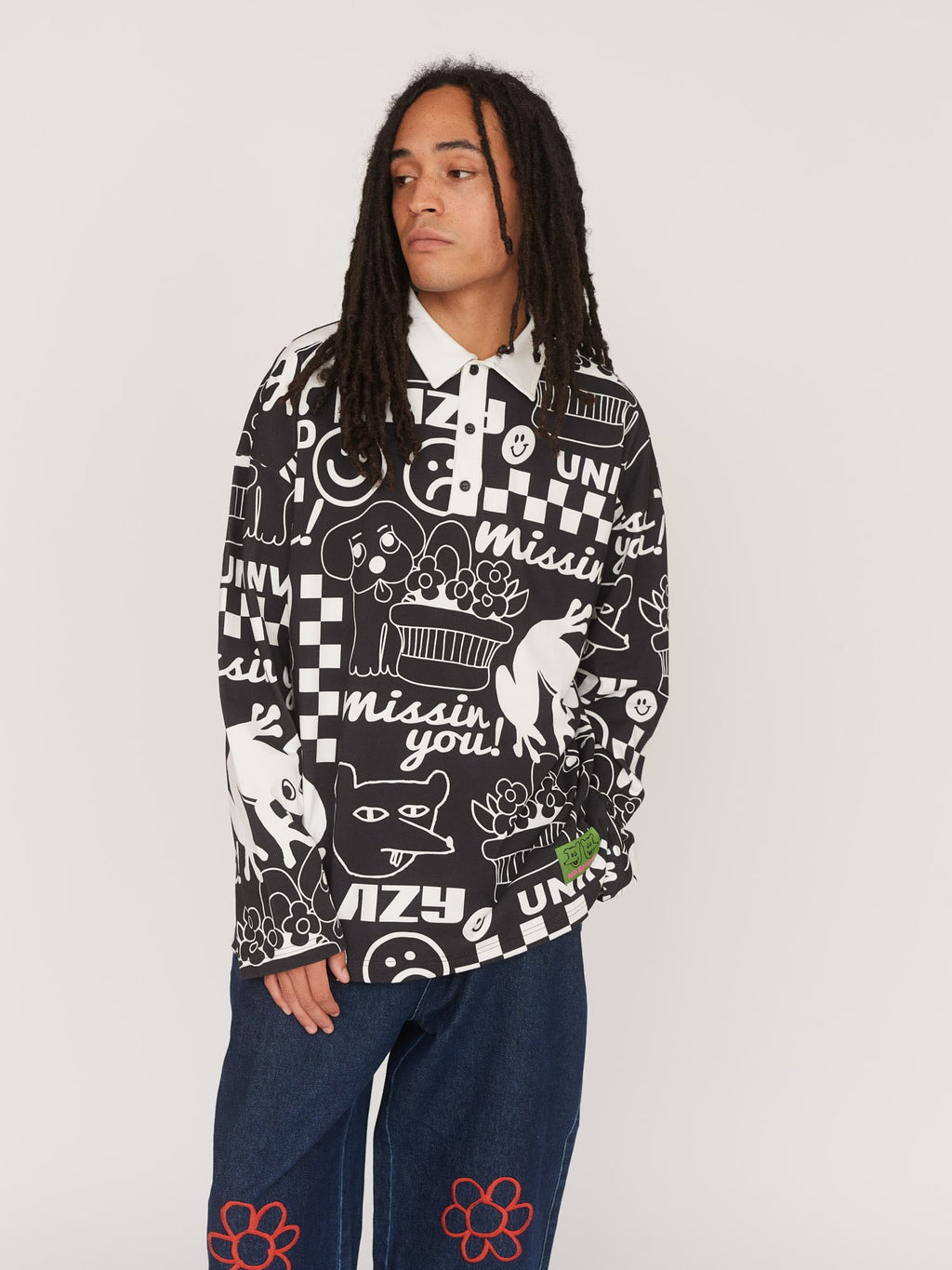 This black 100% cotton, rugby style top is offset by a contrasting white all-over graphic, designed by our in-house team, three button placket and collar. With a relaxed, dropped shoulder fit and in a slightly heavier fabric than our tees, this style is perfect for layering up or wearing alone.