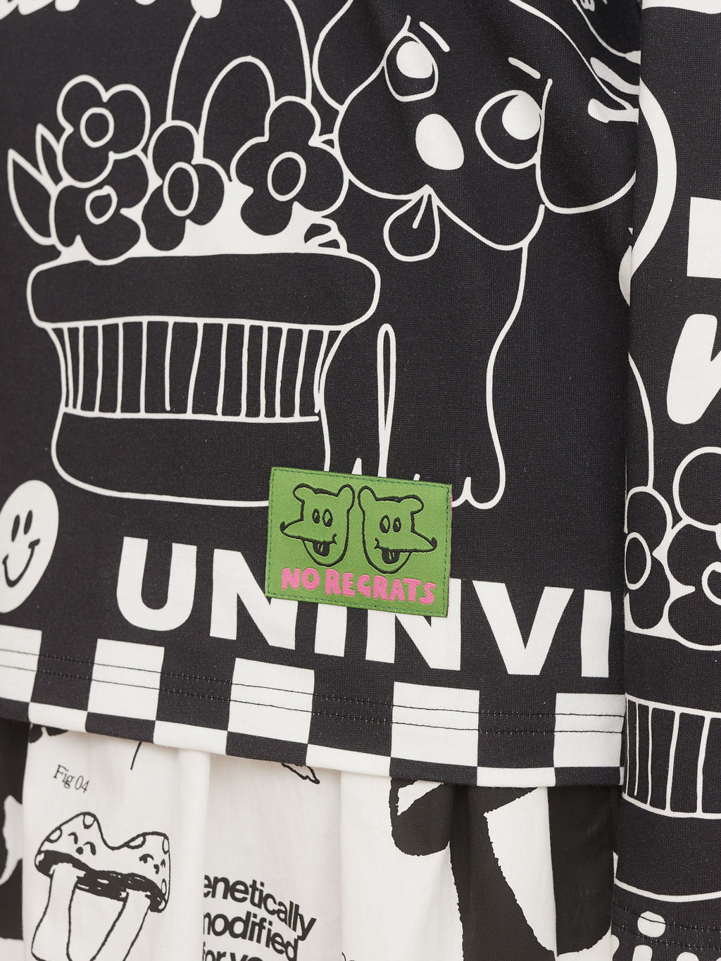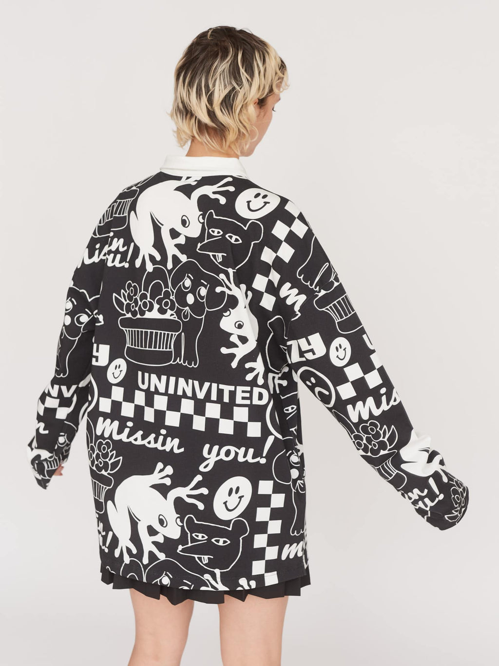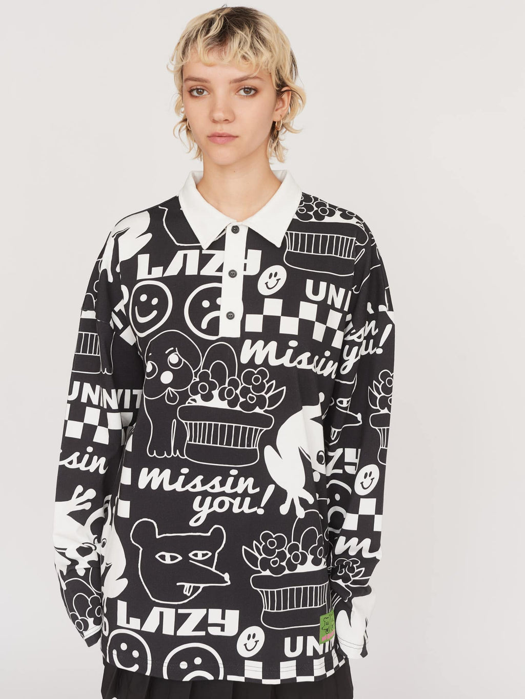 This black 100% cotton, rugby style top is offset by a contrasting white all-over graphic, designed by our in-house team, three button placket and collar. With a relaxed, dropped shoulder fit and in a slightly heavier fabric than our tees, this style is perfect for layering up or wearing alone.